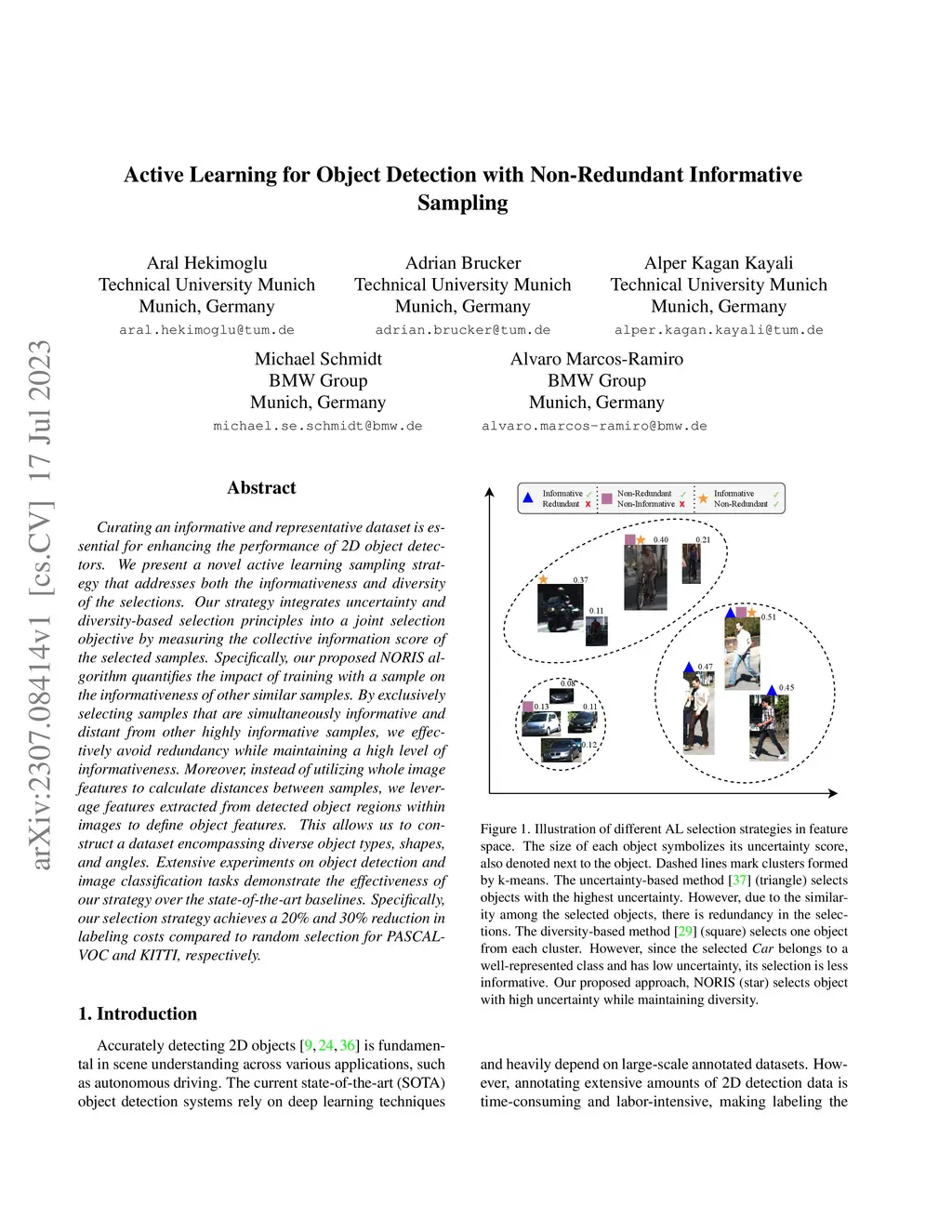 Curating an informative and representative dataset is essential for enhancing the performance of 2D object detectors. We present a novel active learning sampling strategy that addresses both the informativeness and diversity of the selections. Our strategy integrates uncertainty and diversity-based selection principles into a joint selection objective by measuring the collective information score of the selected samples. Specifically, our proposed NORIS algorithm quantifies the impact of training with a sample on the informativeness of other similar samples. By exclusively selecting samples that are simultaneously informative and distant from other highly informative samples, we effectively avoid redundancy while maintaining a high level of informativeness. Moreover, instead of utilizing whole image features to calculate distances between samples, we leverage features extracted from detected object regions within images to define object features. This allows us to construct a dataset encompassing diverse object types, shapes, and angles. Extensive experiments on object detection and image classification tasks demonstrate the effectiveness of our strategy over the state-of-the-art baselines. Specifically, our selection strategy achieves a 20% and 30% reduction in labeling costs compared to random selection for PASCAL-VOC and KITTI, respectively.