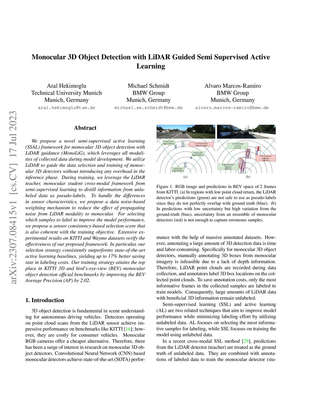 Monocular 3D Object Detection with LiDAR Guided Semi Supervised Active