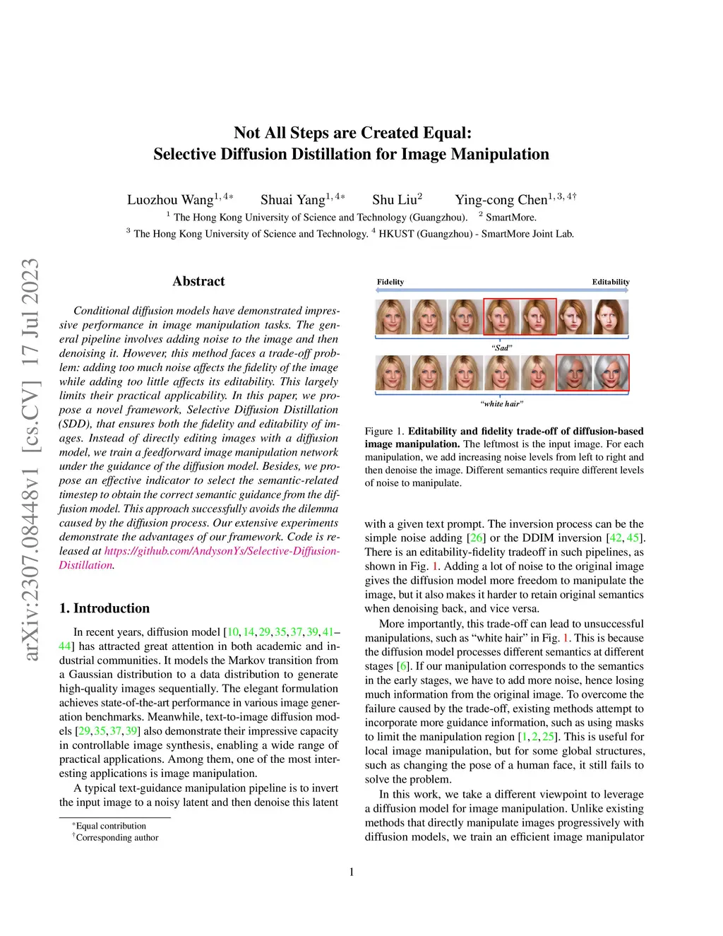 Conditional diffusion models have demonstrated impressive performance in image manipulation tasks. The general pipeline involves adding noise to the image and then denoising it. However, this method faces a trade-off problem: adding too much noise affects the fidelity of the image while adding too little affects its editability. This largely limits their practical applicability. In this paper, we propose a novel framework, Selective Diffusion Distillation (SDD), that ensures both the fidelity and editability of images. Instead of directly editing images with a diffusion model, we train a feedforward image manipulation network under the guidance of the diffusion model. Besides, we propose an effective indicator to select the semantic-related timestep to obtain the correct semantic guidance from the diffusion model. This approach successfully avoids the dilemma caused by the diffusion process. Our extensive experiments demonstrate the advantages of our framework. Code is released at https://github.com/AndysonYs/Selective-Diffusion-Distillation.