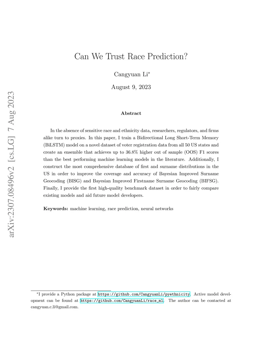 In the absence of sensitive race and ethnicity data, researchers, regulators, and firms alike turn to proxies. In this paper, I train a Bidirectional Long Short-Term Memory (BiLSTM) model on a novel dataset of voter registration data from all 50 US states and create an ensemble that achieves up to 36.8% higher out of sample (OOS) F1 scores than the best performing machine learning models in the literature. Additionally, I construct the most comprehensive database of first and surname distributions in the US in order to improve the coverage and accuracy of Bayesian Improved Surname Geocoding (BISG) and Bayesian Improved Firstname Surname Geocoding (BIFSG). Finally, I provide the first high-quality benchmark dataset in order to fairly compare existing models and aid future model developers.
