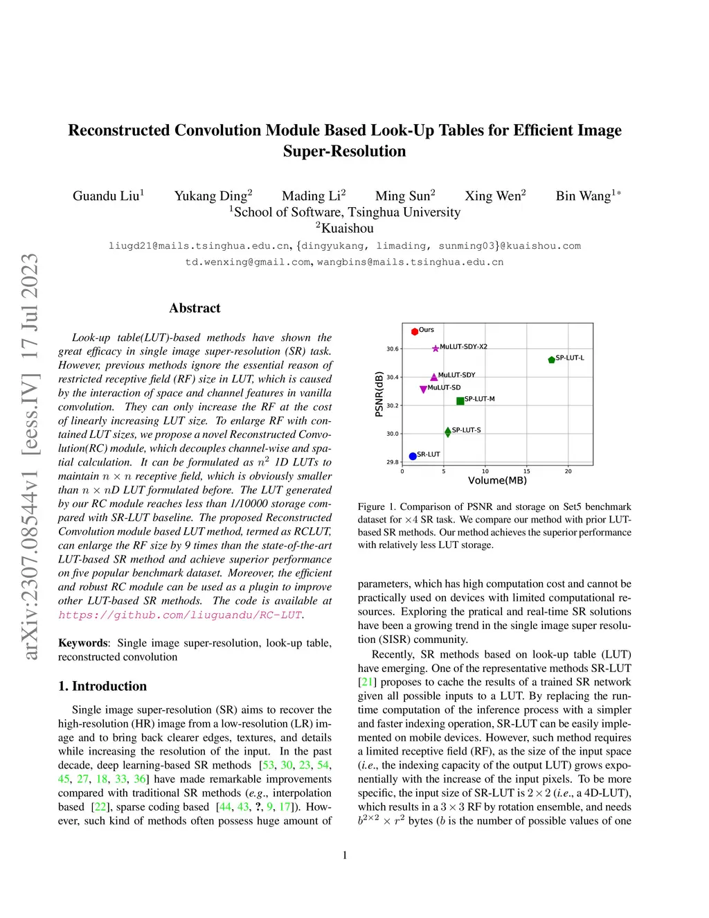 Look-up table(LUT)-based methods have shown the great efficacy in single image super-resolution (SR) task. However, previous methods ignore the essential reason of restricted receptive field (RF) size in LUT, which is caused by the interaction of space and channel features in vanilla convolution. They can only increase the RF at the cost of linearly increasing LUT size. To enlarge RF with contained LUT sizes, we propose a novel Reconstructed Convolution(RC) module, which decouples channel-wise and spatial calculation. It can be formulated as 1D LUTs to maintain receptive field, which is obviously smaller than D LUT formulated before. The LUT generated by our RC module reaches less than 1/10000 storage compared with SR-LUT baseline. The proposed Reconstructed Convolution module based LUT method, termed as RCLUT, can enlarge the RF size by 9 times than the state-of-the-art LUT-based SR method and achieve superior performance on five popular benchmark dataset. Moreover, the efficient and robust RC module can be used as a plugin to improve other LUT-based SR methods. The code is available at https://github.com/liuguandu/RC-LUT.