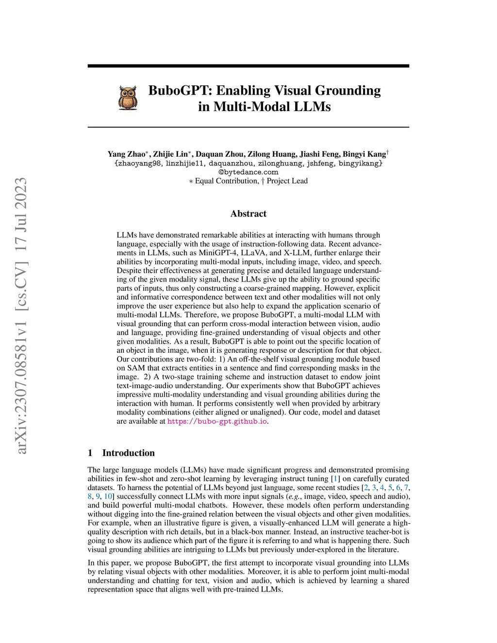 LLMs have demonstrated remarkable abilities at interacting with humans through language, especially with the usage of instruction-following data. Recent advancements in LLMs, such as MiniGPT-4, LLaVA, and X-LLM, further enlarge their abilities by incorporating multi-modal inputs, including image, video, and speech. Despite their effectiveness at generating precise and detailed language understanding of the given modality signal, these LLMs give up the ability to ground specific parts of inputs, thus only constructing a coarse-grained mapping. However, explicit and informative correspondence between text and other modalities will not only improve the user experience but also help to expand the application scenario of multi-modal LLMs. Therefore, we propose BuboGPT, a multi-modal LLM with visual grounding that can perform cross-modal interaction between vision, audio and language, providing fine-grained understanding of visual objects and other given modalities. As a result, BuboGPT is able to point out the specific location of an object in the image, when it is generating response or description for that object. Our contributions are two-fold: 1) An off-the-shelf visual grounding module based on SAM that extracts entities in a sentence and find corresponding masks in the image. 2) A two-stage training scheme and instruction dataset to endow joint text-image-audio understanding. Our experiments show that BuboGPT achieves impressive multi-modality understanding and visual grounding abilities during the interaction with human. It performs consistently well when provided by arbitrary modality combinations (either aligned or unaligned). Our code, model and dataset are available at https://bubo-gpt.github.io .