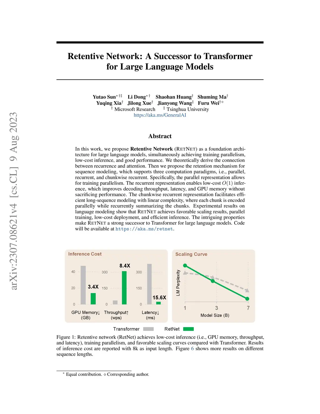 Retentive Network: A Successor to Transformer for Large Language Models