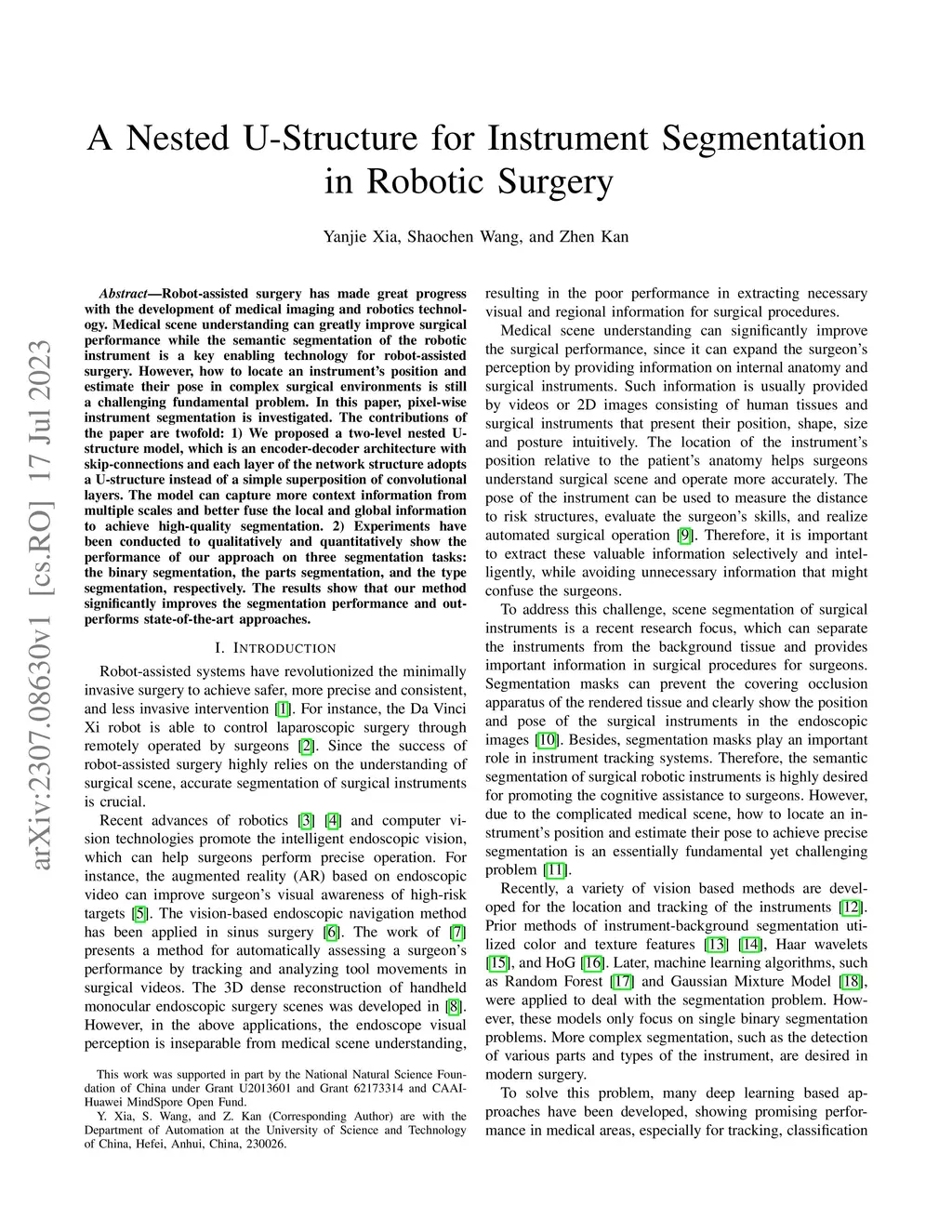 Robot-assisted surgery has made great progress with the development of medical imaging and robotics technology. Medical scene understanding can greatly improve surgical performance while the semantic segmentation of the robotic instrument is a key enabling technology for robot-assisted surgery. However, how to locate an instrument's position and estimate their pose in complex surgical environments is still a challenging fundamental problem. In this paper, pixel-wise instrument segmentation is investigated. The contributions of the paper are twofold: 1) We proposed a two-level nested U-structure model, which is an encoder-decoder architecture with skip-connections and each layer of the network structure adopts a U-structure instead of a simple superposition of convolutional layers. The model can capture more context information from multiple scales and better fuse the local and global information to achieve high-quality segmentation. 2) Experiments have been conducted to qualitatively and quantitatively show the performance of our approach on three segmentation tasks: the binary segmentation, the parts segmentation, and the type segmentation, respectively.