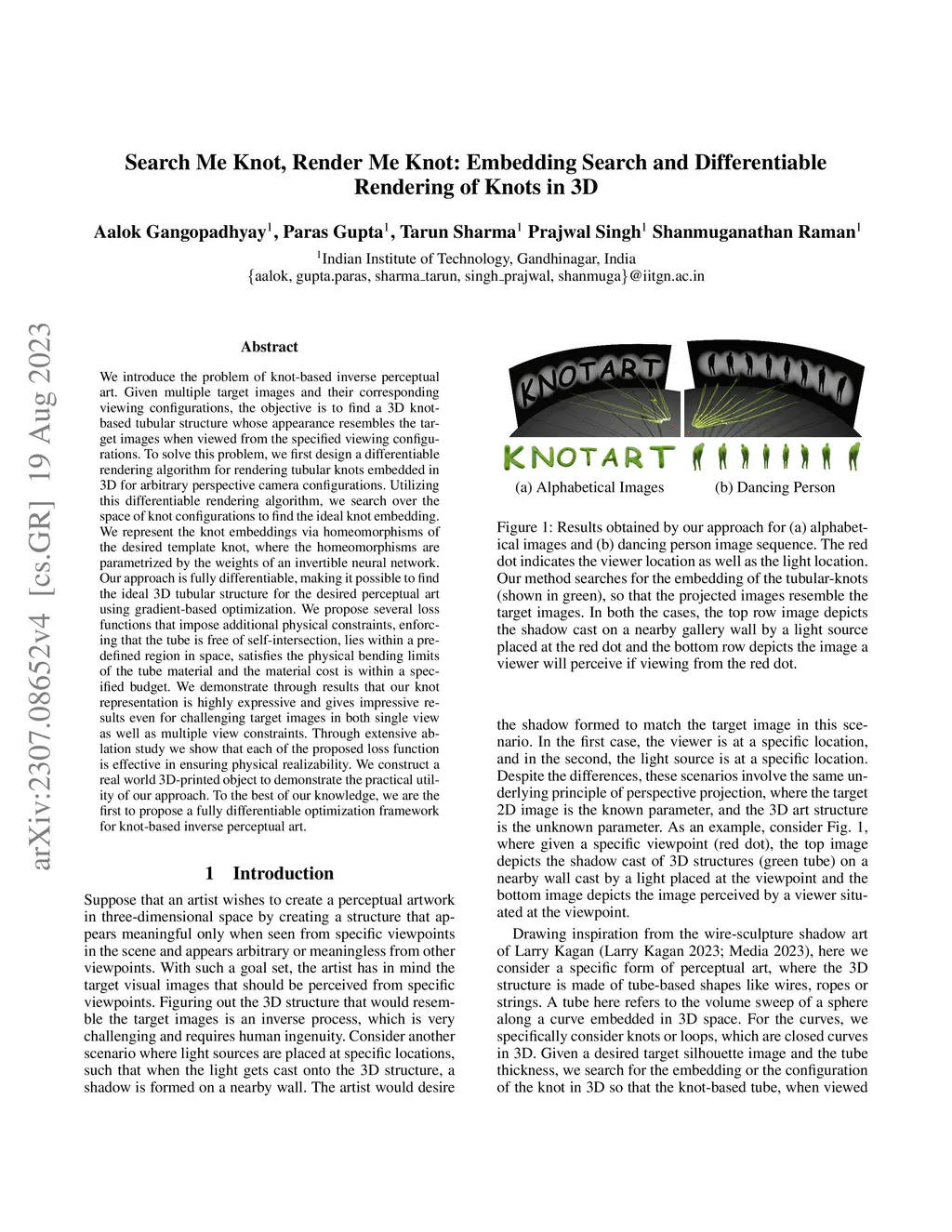 We introduce the problem of knot-based inverse perceptual art. Given multiple target images and their corresponding viewing configurations, the objective is to find a 3D knot-based tubular structure whose appearance resembles the target images when viewed from the specified viewing configurations. To solve this problem, we first design a differentiable rendering algorithm for rendering tubular knots embedded in 3D for arbitrary perspective camera configurations. Utilizing this differentiable rendering algorithm, we search over the space of knot configurations to find the ideal knot embedding. We represent the knot embeddings via homeomorphisms of the desired template knot, where the homeomorphisms are parametrized by the weights of an invertible neural network. Our approach is fully differentiable, making it possible to find the ideal 3D tubular structure for the desired perceptual art using gradient-based optimization. We propose several loss functions that impose additional physical constraints, enforcing that the tube is free of self-intersection, lies within a predefined region in space, satisfies the physical bending limits of the tube material and the material cost is within a specified budget. We demonstrate through results that our knot representation is highly expressive and gives impressive results even for challenging target images in both single view as well as multiple view constraints. Through extensive ablation study we show that each of the proposed loss function is effective in ensuring physical realizability. We construct a real world 3D-printed object to demonstrate the practical utility of our approach. To the best of our knowledge, we are the first to propose a fully differentiable optimization framework for knot-based inverse perceptual art.
