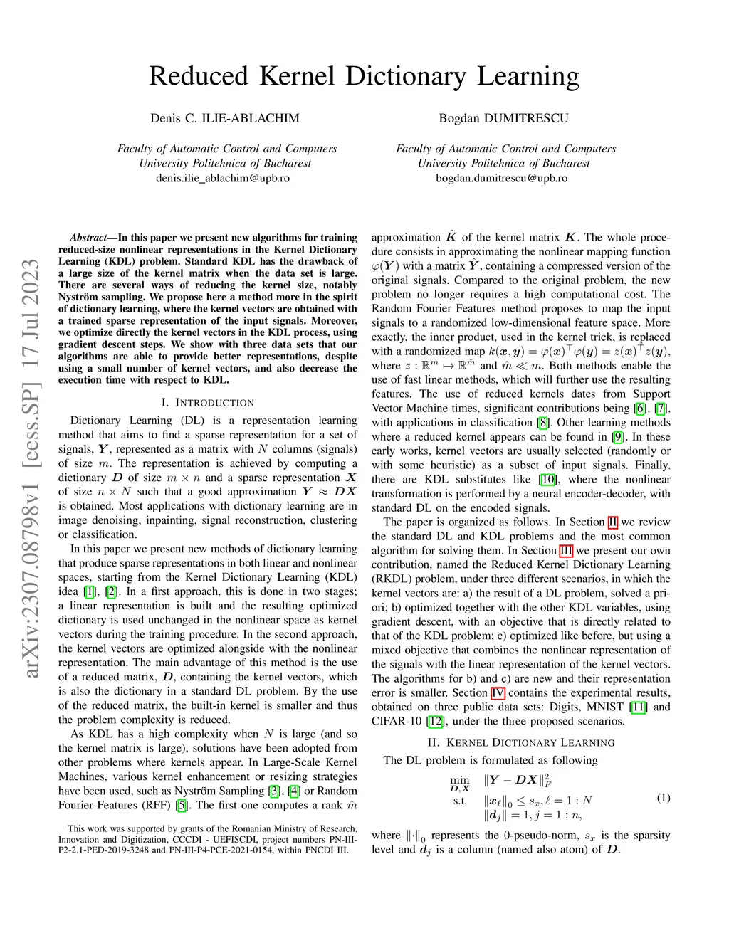 In this paper we present new algorithms for training reduced-size nonlinear representations in the Kernel Dictionary Learning (KDL) problem. Standard KDL has the drawback of a large size of the kernel matrix when the data set is large. There are several ways of reducing the kernel size, notably Nystr\"om sampling. We propose here a method more in the spirit of dictionary learning, where the kernel vectors are obtained with a trained sparse representation of the input signals. Moreover, we optimize directly the kernel vectors in the KDL process, using gradient descent steps. We show with three data sets that our algorithms are able to provide better representations, despite using a small number of kernel vectors, and also decrease the execution time with respect to KDL.