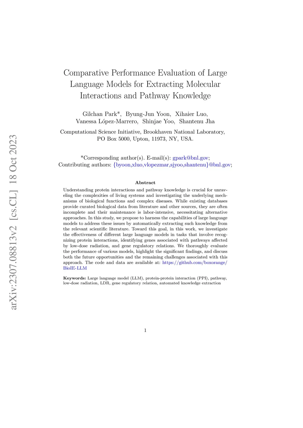 Background: Identification of the interactions and regulatory relations between biomolecules play pivotal roles in understanding complex biological systems and the mechanisms underlying diverse biological functions. However, the collection of such molecular interactions has heavily relied on expert curation in the past, making it labor-intensive and time-consuming. To mitigate these challenges, we propose leveraging the capabilities of large language models (LLMs) to automate genome-scale extraction of this crucial knowledge.Results: In this study, we investigate the efficacy of various LLMs in addressing biological tasks, such as the recognition of protein interactions, identification of genes linked to pathways affected by low-dose radiation, and the delineation of gene regulatory relationships. Overall, the larger models exhibited superior performance, indicating their potential for specific tasks that involve the extraction of complex interactions among genes and proteins. Although these models possessed detailed information for distinct gene and protein groups, they faced challenges in identifying groups with diverse functions and in recognizing highly correlated gene regulatory relationships.Conclusions: By conducting a comprehensive assessment of the state-of-the-art models using well-established molecular interaction and pathway databases, our study reveals that LLMs can identify genes/proteins associated with pathways of interest and predict their interactions to a certain extent. Furthermore, these models can provide important insights, marking a noteworthy stride toward advancing our understanding of biological systems through AI-assisted knowledge discovery.