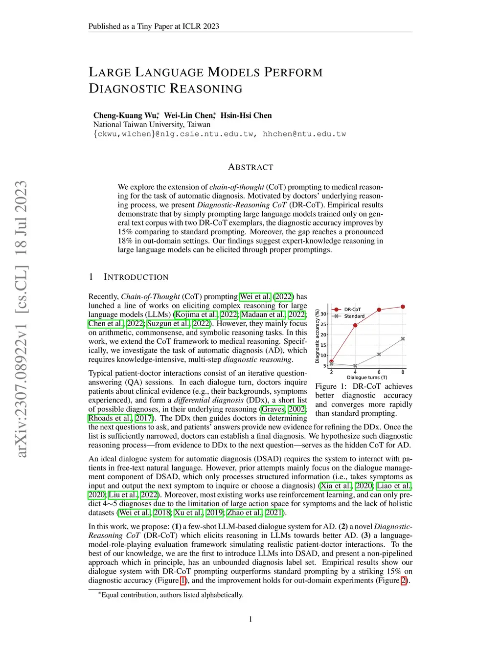 We explore the extension of chain-of-thought (CoT) prompting to medical reasoning for the task of automatic diagnosis. Motivated by doctors' underlying reasoning process, we present Diagnostic-Reasoning CoT (DR-CoT). Empirical results demonstrate that by simply prompting large language models trained only on general text corpus with two DR-CoT exemplars, the diagnostic accuracy improves by 15% comparing to standard prompting. Moreover, the gap reaches a pronounced 18% in out-domain settings. Our findings suggest expert-knowledge reasoning in large language models can be elicited through proper promptings.