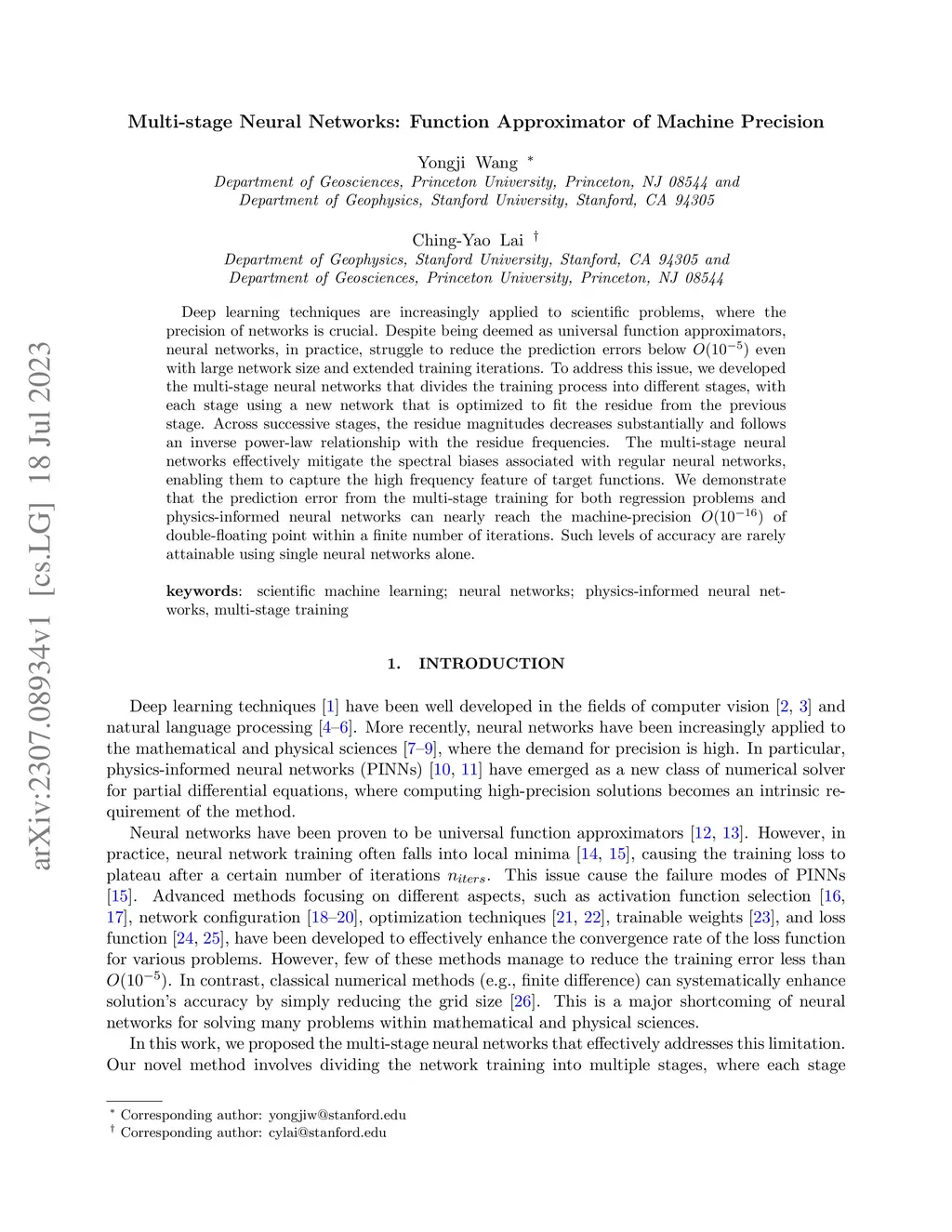 Deep learning techniques are increasingly applied to scientific problems, where the precision of networks is crucial. Despite being deemed as universal function approximators, neural networks, in practice, struggle to reduce the prediction errors below even with large network size and extended training iterations. To address this issue, we developed the multi-stage neural networks that divides the training process into different stages, with each stage using a new network that is optimized to fit the residue from the previous stage. Across successive stages, the residue magnitudes decreases substantially and follows an inverse power-law relationship with the residue frequencies. The multi-stage neural networks effectively mitigate the spectral biases associated with regular neural networks, enabling them to capture the high frequency feature of target functions. We demonstrate that the prediction error from the multi-stage training for both regression problems and physics-informed neural networks can nearly reach the machine-precision of double-floating point within a finite number of iterations. Such levels of accuracy are rarely attainable using single neural networks alone.