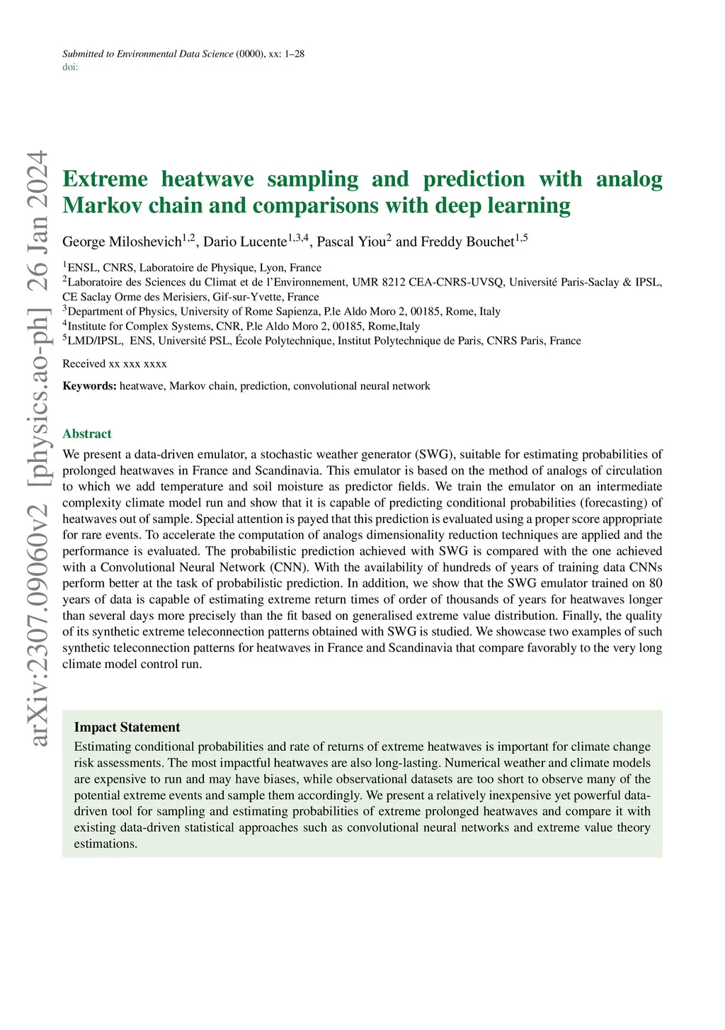 We present a data-driven emulator, stochastic weather generator (SWG), suitable for estimating probabilities of prolonged heatwaves in France and Scandinavia. This emulator is based on the method of analogs of circulation to which we add temperature and soil moisture as predictor fields. We train the emulator on an intermediate complexity climate model run and show that it is capable of predicting conditional probabilities (forecasting) of heatwaves out of sample. Special attention is payed that this prediction is evaluated using proper score appropriate for rare events. To accelerate the computation of analogs dimensionality reduction techniques are applied and the performance is evaluated. The probabilistic prediction achieved with SWG is compared with the one achieved with Convolutional Neural Network (CNN). With the availability of hundreds of years of training data CNNs perform better at the task of probabilistic prediction. In addition, we show that the SWG emulator trained on 80 years of data is capable of estimating extreme return times of order of thousands of years for heatwaves longer than several days more precisely than the fit based on generalised extreme value distribution. Finally, the quality of its synthetic extreme teleconnection patterns obtained with stochastic weather generator is studied. We showcase two examples of such synthetic teleconnection patterns for heatwaves in France and Scandinavia that compare favorably to the very long climate model control run.
