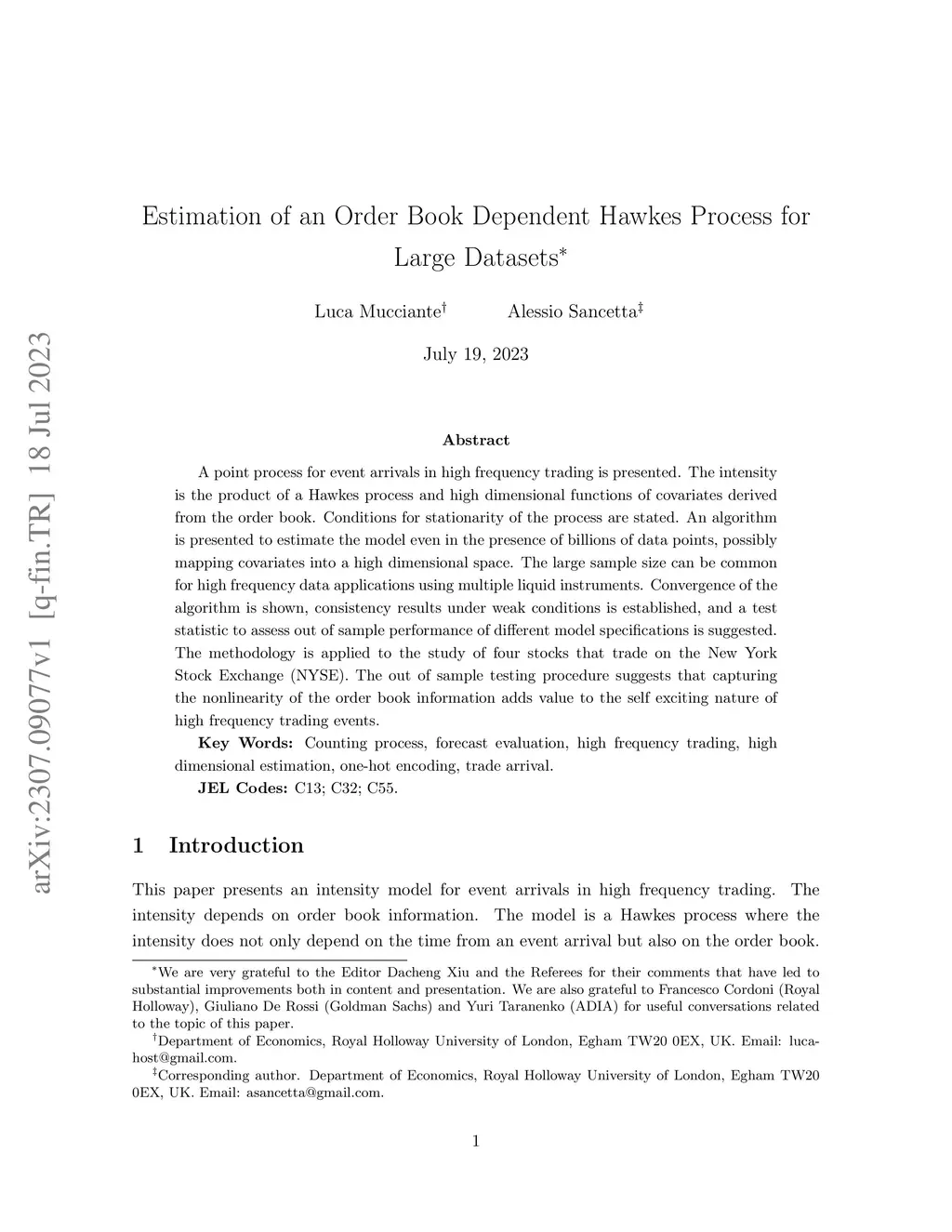 A point process for event arrivals in high frequency trading is presented. The intensity is the product of a Hawkes process and high dimensional functions of covariates derived from the order book. Conditions for stationarity of the process are stated. An algorithm is presented to estimate the model even in the presence of billions of data points, possibly mapping covariates into a high dimensional space. The large sample size can be common for high frequency data applications using multiple liquid instruments. Convergence of the algorithm is shown, consistency results under weak conditions is established, and a test statistic to assess out of sample performance of different model specifications is suggested. The methodology is applied to the study of four stocks that trade on the New York Stock Exchange (NYSE). The out of sample testing procedure suggests that capturing the nonlinearity of the order book information adds value to the self exciting nature of high frequency trading events.
