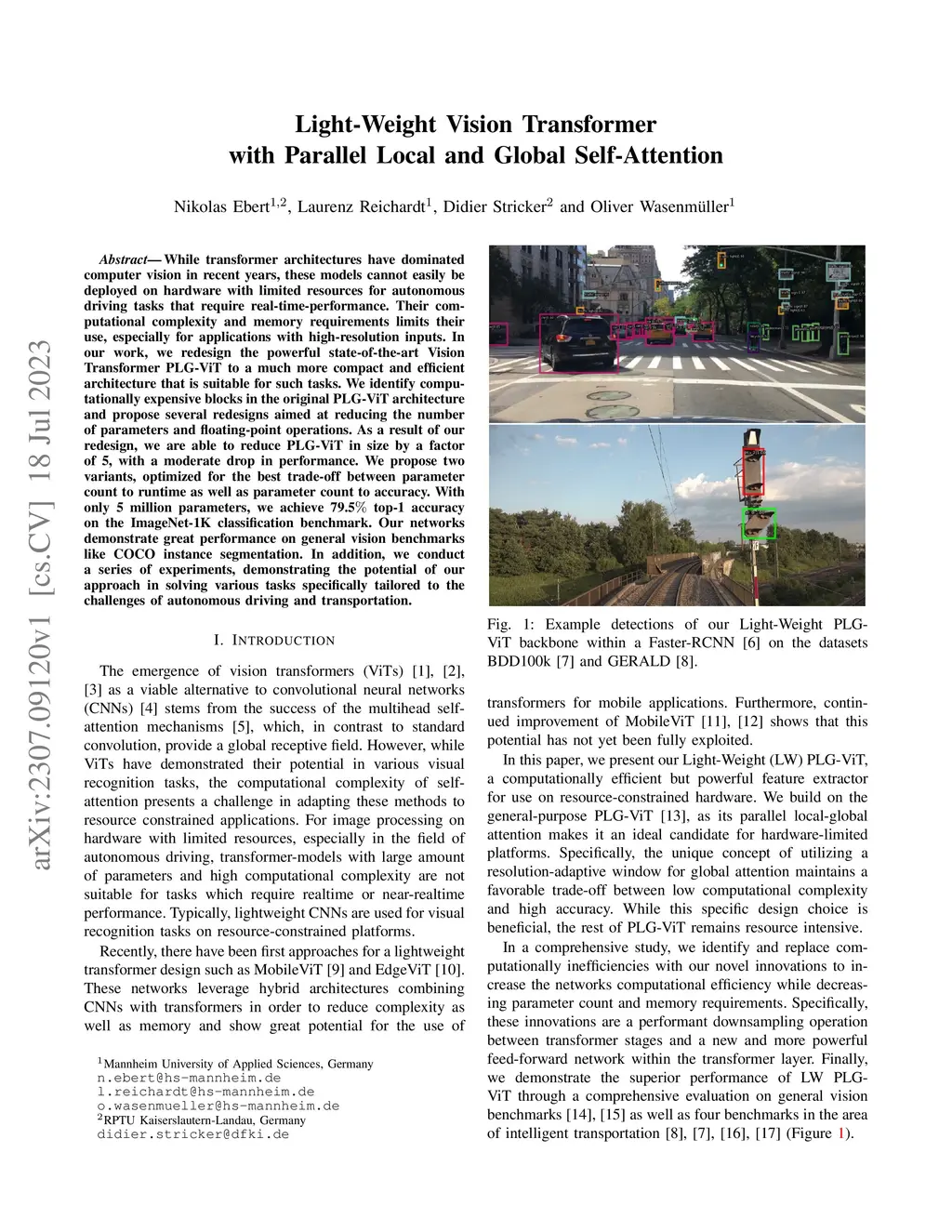 While transformer architectures have dominated computer vision in recent years, these models cannot easily be deployed on hardware with limited resources for autonomous driving tasks that require real-time-performance. Their computational complexity and memory requirements limits their use, especially for applications with high-resolution inputs. In our work, we redesign the powerful state-of-the-art Vision Transformer PLG-ViT to a much more compact and efficient architecture that is suitable for such tasks. We identify computationally expensive blocks in the original PLG-ViT architecture and propose several redesigns aimed at reducing the number of parameters and floating-point operations. As a result of our redesign, we are able to reduce PLG-ViT in size by a factor of 5, with a moderate drop in performance. We propose two variants, optimized for the best trade-off between parameter count to runtime as well as parameter count to accuracy. With only 5 million parameters, we achieve 79.5 top-1 accuracy on the ImageNet-1K classification benchmark. Our networks demonstrate great performance on general vision benchmarks like COCO instance segmentation. In addition, we conduct a series of experiments, demonstrating the potential of our approach in solving various tasks specifically tailored to the challenges of autonomous driving and transportation.