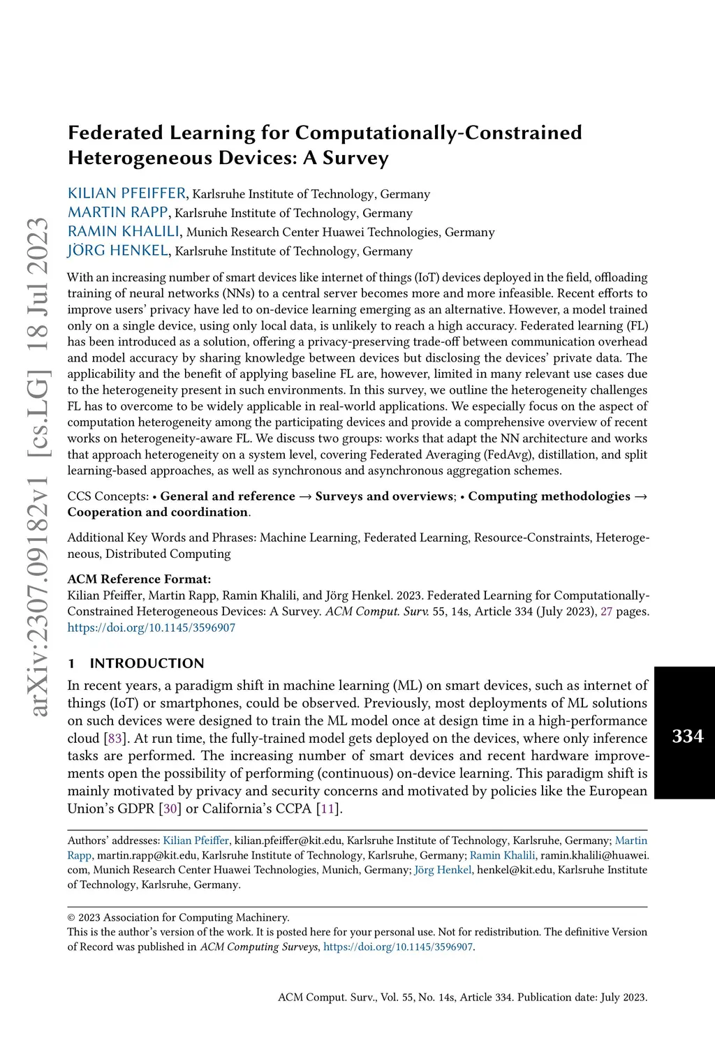 With an increasing number of smart devices like internet of things (IoT) devices deployed in the field, offloadingtraining of neural networks (NNs) to a central server becomes more and more infeasible. Recent efforts toimprove users' privacy have led to on-device learning emerging as an alternative. However, a model trainedonly on a single device, using only local data, is unlikely to reach a high accuracy. Federated learning (FL)has been introduced as a solution, offering a privacy-preserving trade-off between communication overheadand model accuracy by sharing knowledge between devices but disclosing the devices' private data. Theapplicability and the benefit of applying baseline FL are, however, limited in many relevant use cases dueto the heterogeneity present in such environments. In this survey, we outline the heterogeneity challengesFL has to overcome to be widely applicable in real-world applications. We especially focus on the aspect ofcomputation heterogeneity among the participating devices and provide a comprehensive overview of recentworks on heterogeneity-aware FL. We discuss two groups: works that adapt the NN architecture and worksthat approach heterogeneity on a system level, covering Federated Averaging (FedAvg), distillation, and splitlearning-based approaches, as well as synchronous and asynchronous aggregation schemes.