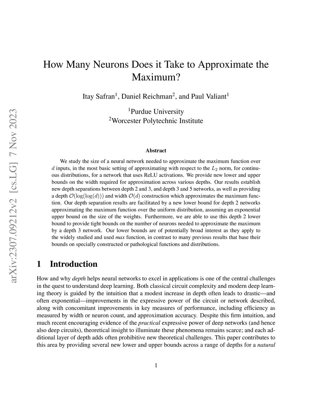 We study the size of a neural network needed to approximate the maximum function over inputs, in the most basic setting of approximating with respect to the norm, for continuous distributions, for a network that uses ReLU activations. We provide new lower and upper bounds on the width required for approximation across various depths. Our results establish new depth separations between depth 2 and 3, and depth 3 and 5 networks, as well as providing a depth and width construction which approximates the maximum function. Our depth separation results are facilitated by a new lower bound for depth 2 networks approximating the maximum function over the uniform distribution, assuming an exponential upper bound on the size of the weights. Furthermore, we are able to use this depth 2 lower bound to provide tight bounds on the number of neurons needed to approximate the maximum by a depth 3 network. Our lower bounds are of potentially broad interest as they apply to the widely studied and used \emph{max} function, in contrast to many previous results that base their bounds on specially constructed or pathological functions and distributions.