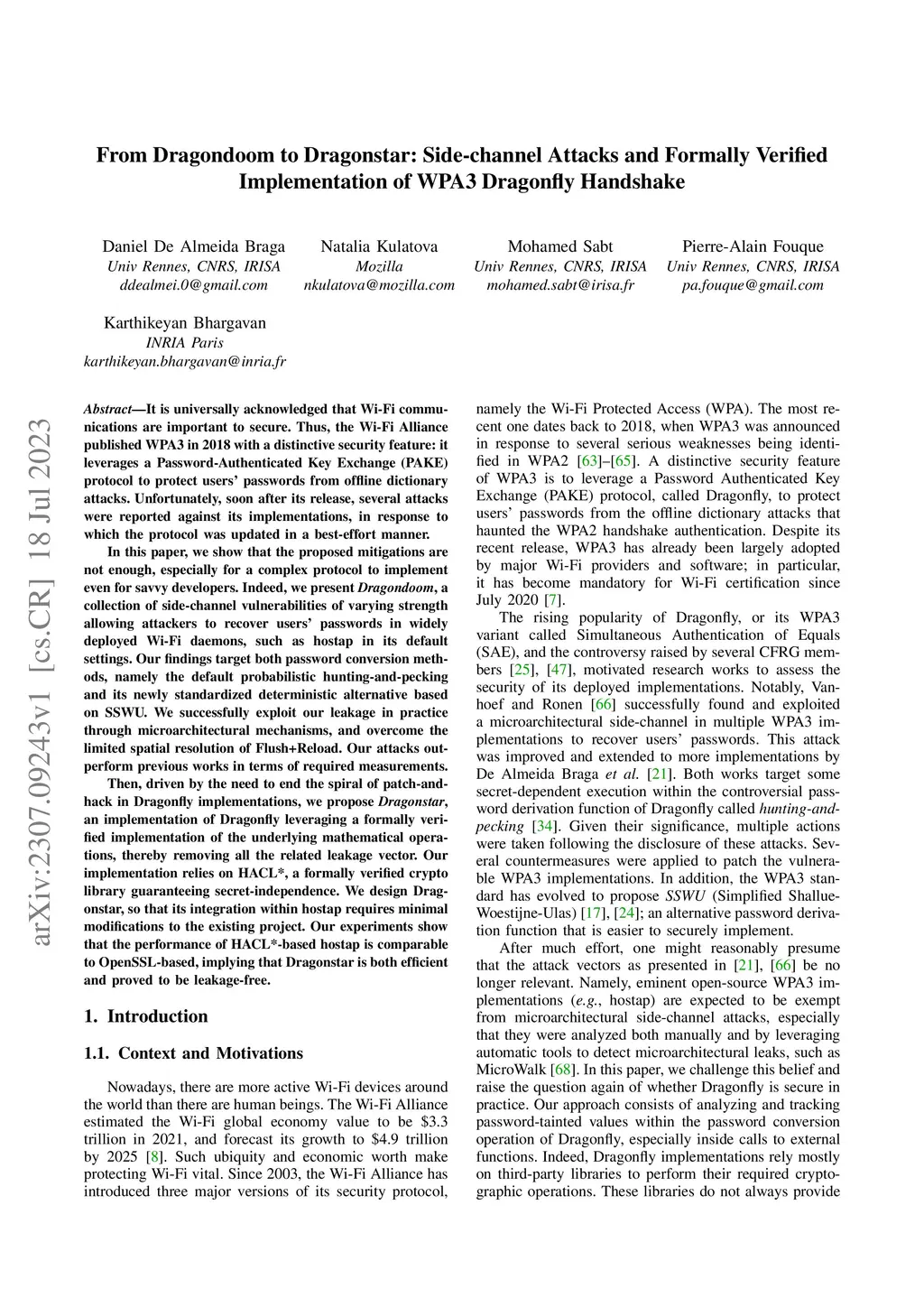 It is universally acknowledged that Wi-Fi communications are important to secure. Thus, the Wi-Fi Alliance published WPA3 in 2018 with a distinctive security feature: it leverages a Password-Authenticated Key Exchange (PAKE) protocol to protect users' passwords from offline dictionary attacks. Unfortunately, soon after its release, several attacks were reported against its implementations, in response to which the protocol was updated in a best-effort manner. In this paper, we show that the proposed mitigations are not enough, especially for a complex protocol to implement even for savvy developers. Indeed, we present **Dragondoom**, a collection of side-channel vulnerabilities of varying strength allowing attackers to recover users' passwords in widely deployed Wi-Fi daemons, such as hostap in its default settings. Our findings target both password conversion methods, namely the default probabilistic hunting-and-pecking and its newly standardized deterministic alternative based on SSWU. We successfully exploit our leakage in practice through microarchitectural mechanisms, and overcome the limited spatial resolution of Flush+Reload. Our attacks outperform previous works in terms of required measurements. Then, driven by the need to end the spiral of patch-and-hack in Dragonfly implementations, we propose **Dragonstar**, an implementation of Dragonfly leveraging a formally verified implementation of the underlying mathematical operations, thereby removing all the related leakage vector. Our implementation relies on HACL*, a formally verified crypto library guaranteeing secret-independence. We design Dragonstar, so that its integration within hostap requires minimal modifications to the existing project. Our experiments show that the performance of HACL*-based hostap is comparable to OpenSSL-based, implying that Dragonstar is both efficient and proved to be leakage-free.