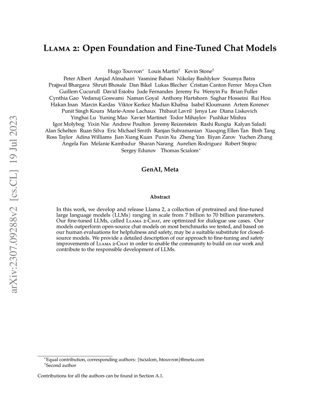 In this work, we develop and release Llama 2, a collection of pretrained and fine-tuned large language models (LLMs) ranging in scale from 7 billion to 70 billion parameters. Our fine-tuned LLMs, called Llama 2-Chat, are optimized for dialogue use cases. Our models outperform open-source chat models on most benchmarks we tested, and based on our human evaluations for helpfulness and safety, may be a suitable substitute for closed-source models. We provide a detailed description of our approach to fine-tuning and safety improvements of Llama 2-Chat in order to enable the community to build on our work and contribute to the responsible development of LLMs.