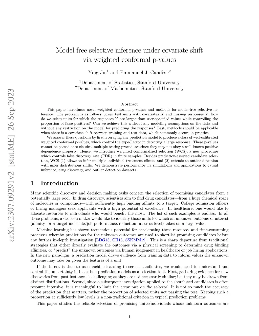 This paper introduces novel weighted conformal p-values and methods for model-free selective inference. The problem is as follows: given test units with covariates and missing responses , how do we select units for which the responses are larger than user-specified values while controlling the proportion of false positives? Can we achieve this without any modeling assumptions on the data and without any restriction on the model for predicting the responses? Last, methods should be applicable when there is a covariate shift between training and test data, which commonly occurs in practice. We answer these questions by first leveraging any prediction model to produce a class of well-calibrated weighted conformal p-values, which control the type-I error in detecting a large response. These p-values cannot be passed on to classical multiple testing procedures since they may not obey a well-known positive dependence property. Hence, we introduce weighted conformalized selection (WCS), a new procedure which controls false discovery rate (FDR) in finite samples. Besides prediction-assisted candidate selection, WCS (1) allows to infer multiple individual treatment effects, and (2) extends to outlier detection with inlier distributions shifts. We demonstrate performance via simulations and applications to causal inference, drug discovery, and outlier detection datasets.