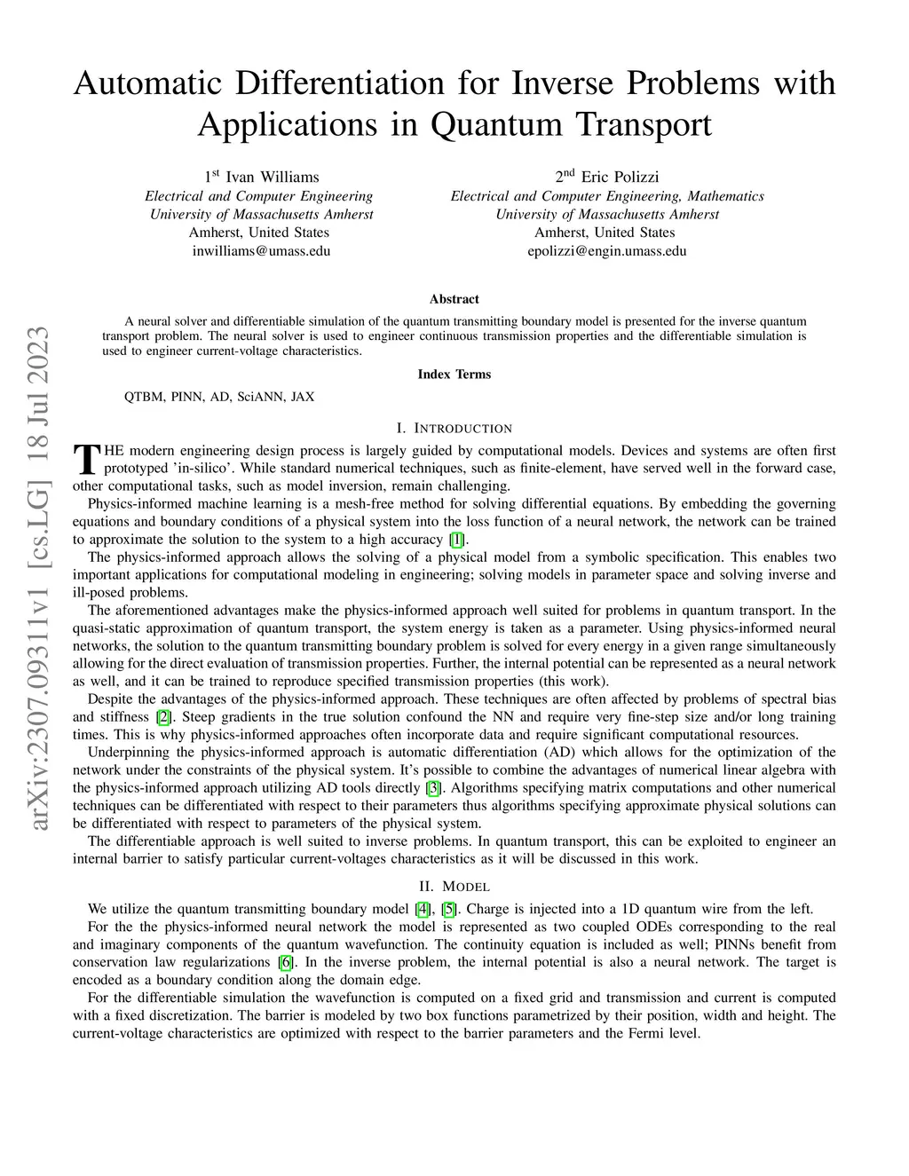 A neural solver and differentiable simulation of the quantum transmitting boundary model is presented for the inverse quantum transport problem. The neural solver is used to engineer continuous transmission properties and the differentiable simulation is used to engineer current-voltage characteristics.