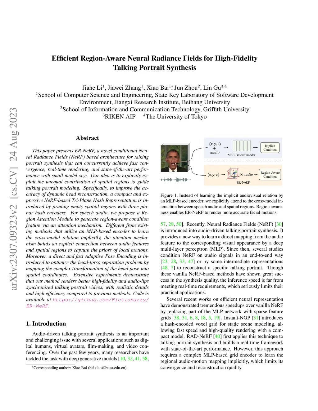 This paper presents ER-NeRF, a novel conditional Neural Radiance Fields (NeRF) based architecture for talking portrait synthesis that can concurrently achieve fast convergence, real-time rendering, and state-of-the-art performance with small model size. Our idea is to explicitly exploit the unequal contribution of spatial regions to guide talking portrait modeling. Specifically, to improve the accuracy of dynamic head reconstruction, a compact and expressive NeRF-based Tri-Plane Hash Representation is introduced by pruning empty spatial regions with three planar hash encoders. For speech audio, we propose a Region Attention Module to generate region-aware condition feature via an attention mechanism. Different from existing methods that utilize an MLP-based encoder to learn the cross-modal relation implicitly, the attention mechanism builds an explicit connection between audio features and spatial regions to capture the priors of local motions. Moreover, a direct and fast Adaptive Pose Encoding is introduced to optimize the head-torso separation problem by mapping the complex transformation of the head pose into spatial coordinates. Extensive experiments demonstrate that our method renders better high-fidelity and audio-lips synchronized talking portrait videos, with realistic details and high efficiency compared to previous methods.