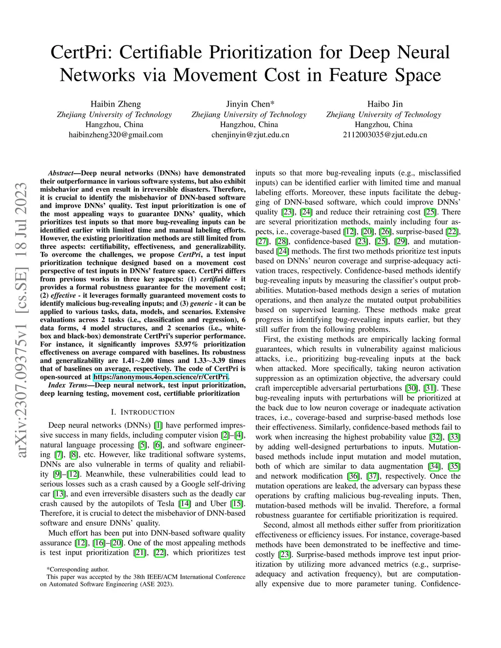Deep neural networks (DNNs) have demonstrated their outperformance in various software systems, but also exhibit misbehavior and even result in irreversible disasters. Therefore, it is crucial to identify the misbehavior of DNN-based software and improve DNNs' quality. Test input prioritization is one of the most appealing ways to guarantee DNNs' quality, which prioritizes test inputs so that more bug-revealing inputs can be identified earlier with limited time and manual labeling efforts. However, the existing prioritization methods are still limited from three aspects: certifiability, effectiveness, and generalizability. To overcome the challenges, we propose CertPri, a test input prioritization technique designed based on a movement cost perspective of test inputs in DNNs' feature space. CertPri differs from previous works in three key aspects: (1) certifiable: it provides a formal robustness guarantee for the movement cost; (2) effective: it leverages formally guaranteed movement costs to identify malicious bug-revealing inputs; and (3) generic: it can be applied to various tasks, data, models, and scenarios. Extensive evaluations across 2 tasks (i.e., classification and regression), 6 data forms, 4 model structures, and 2 scenarios (i.e., white-box and black-box) demonstrate CertPri's superior performance. For instance, it significantly improves 53.97% prioritization effectiveness on average compared with baselines. Its robustness and generalizability are 1.41~2.00 times and 1.33~3.39 times that of baselines on average, respectively.