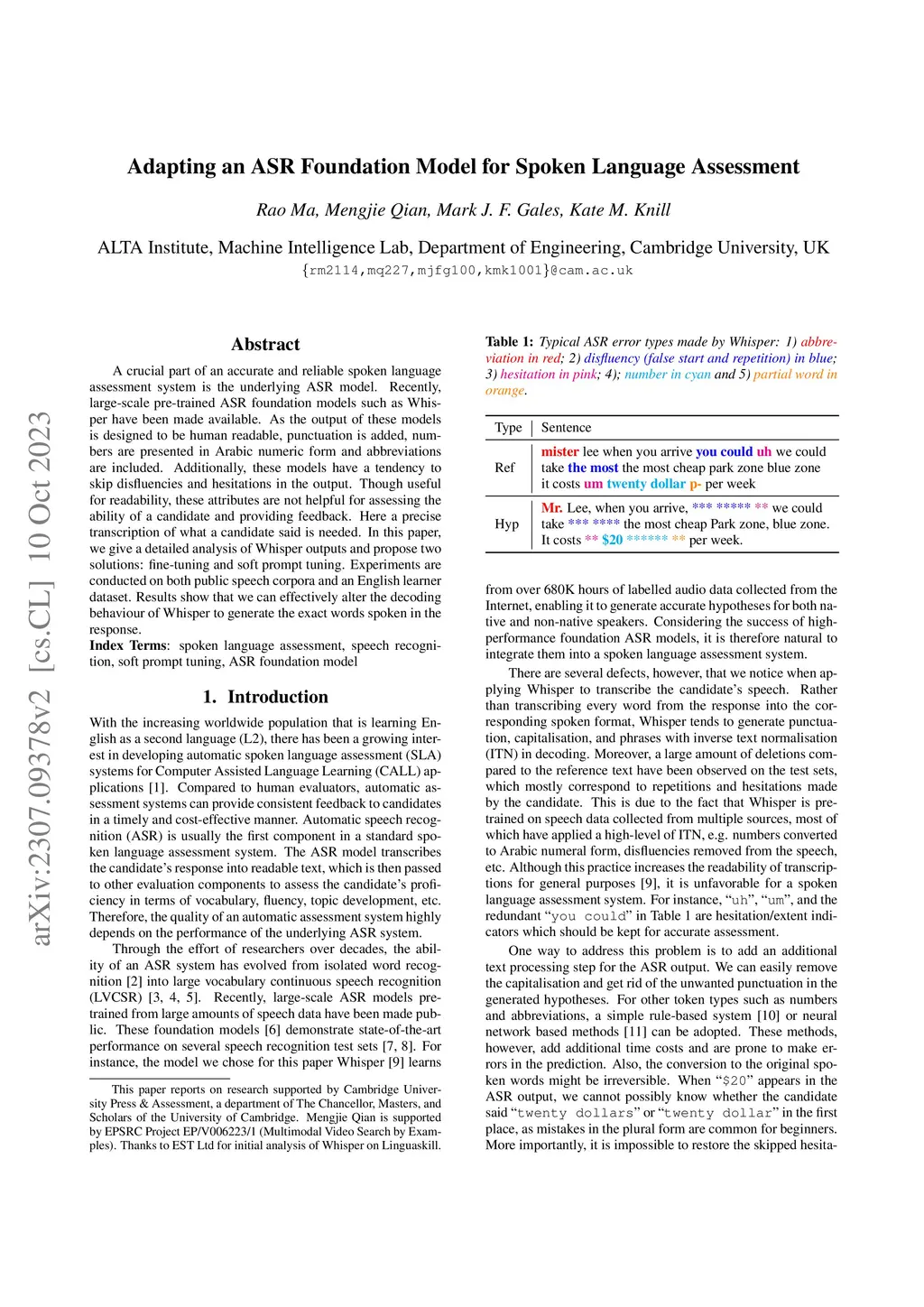 A crucial part of an accurate and reliable spoken language assessment system is the underlying ASR model. Recently, large-scale pre-trained ASR foundation models such as Whisper have been made available. As the output of these models is designed to be human readable, punctuation is added, numbers are presented in Arabic numeric form and abbreviations are included. Additionally, these models have a tendency to skip disfluencies and hesitations in the output. Though useful for readability, these attributes are not helpful for assessing the ability of a candidate and providing feedback. Here a precise transcription of what a candidate said is needed. In this paper, we give a detailed analysis of Whisper outputs and propose two solutions: fine-tuning and soft prompt tuning. Experiments are conducted on both public speech corpora and an English learner dataset. Results show that we can effectively alter the decoding behaviour of Whisper to generate the exact words spoken in the response.