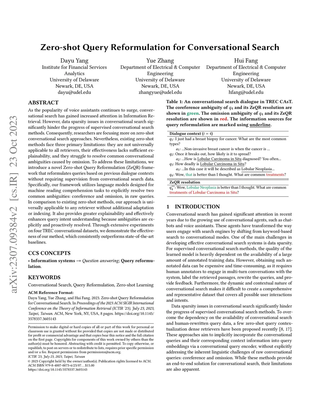 As the popularity of voice assistants continues to surge, conversational search has gained increased attention in Information Retrieval. However, data sparsity issues in conversational search significantly hinder the progress of supervised conversational search methods. Consequently, researchers are focusing more on zero-shot conversational search approaches. Nevertheless, existing zero-shot methods face three primary limitations: they are not universally applicable to all retrievers, their effectiveness lacks sufficient explainability, and they struggle to resolve common conversational ambiguities caused by omission. To address these limitations, we introduce a novel Zero-shot Query Reformulation (ZeQR) framework that reformulates queries based on previous dialogue contexts without requiring supervision from conversational search data. Specifically, our framework utilizes language models designed for machine reading comprehension tasks to explicitly resolve two common ambiguities: coreference and omission, in raw queries. In comparison to existing zero-shot methods, our approach is universally applicable to any retriever without additional adaptation or indexing. It also provides greater explainability and effectively enhances query intent understanding because ambiguities are explicitly and proactively resolved. Through extensive experiments on four TREC conversational datasets, we demonstrate the effectiveness of our method, which consistently outperforms state-of-the-art baselines.