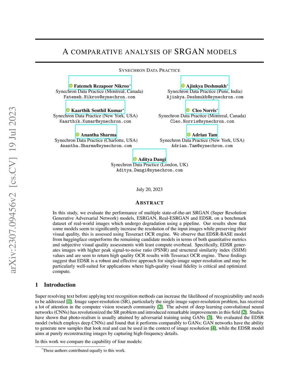 In this study, we evaluate the performance of multiple state-of-the-art SRGAN (Super Resolution Generative Adversarial Network) models, ESRGAN, Real-ESRGAN and EDSR, on a benchmark dataset of real-world images which undergo degradation using a pipeline. Our results show that some models seem to significantly increase the resolution of the input images while preserving their visual quality, this is assessed using Tesseract OCR engine. We observe that EDSR-BASE model from huggingface outperforms the remaining candidate models in terms of both quantitative metrics and subjective visual quality assessments with least compute overhead. Specifically, EDSR generates images with higher peak signal-to-noise ratio (PSNR) and structural similarity index (SSIM) values and are seen to return high quality OCR results with Tesseract OCR engine. These findings suggest that EDSR is a robust and effective approach for single-image super-resolution and may be particularly well-suited for applications where high-quality visual fidelity is critical and optimized compute.