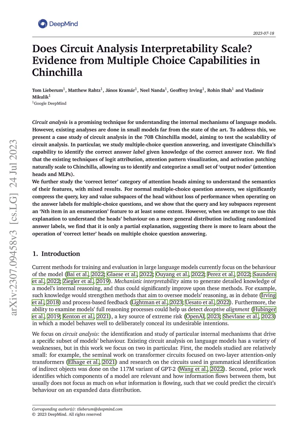 \emph{Circuit analysis} is a promising technique for understanding the internal mechanisms of language models. However, existing analyses are done in small models far from the state of the art. To address this, we present a case study of circuit analysis in the 70B Chinchilla model, aiming to test the scalability of circuit analysis. In particular, we study multiple-choice question answering, and investigate Chinchilla's capability to identify the correct answer \emph{label} given knowledge of the correct answer \emph{text}. We find that the existing techniques of logit attribution, attention pattern visualization, and activation patching naturally scale to Chinchilla, allowing us to identify and categorize a small set of `output nodes' (attention heads and MLPs). We further study the `correct letter' category of attention heads aiming to understand the semantics of their features, with mixed results. For normal multiple-choice question answers, we significantly compress the query, key and value subspaces of the head without loss of performance when operating on the answer labels for multiple-choice questions, and we show that the query and key subspaces represent an `Nth item in an enumeration' feature to at least some extent. However, when we attempt to use this explanation to understand the heads' behaviour on a more general distribution including randomized answer labels, we find that it is only a partial explanation, suggesting there is more to learn about the operation of `correct letter' heads on multiple choice question answering.