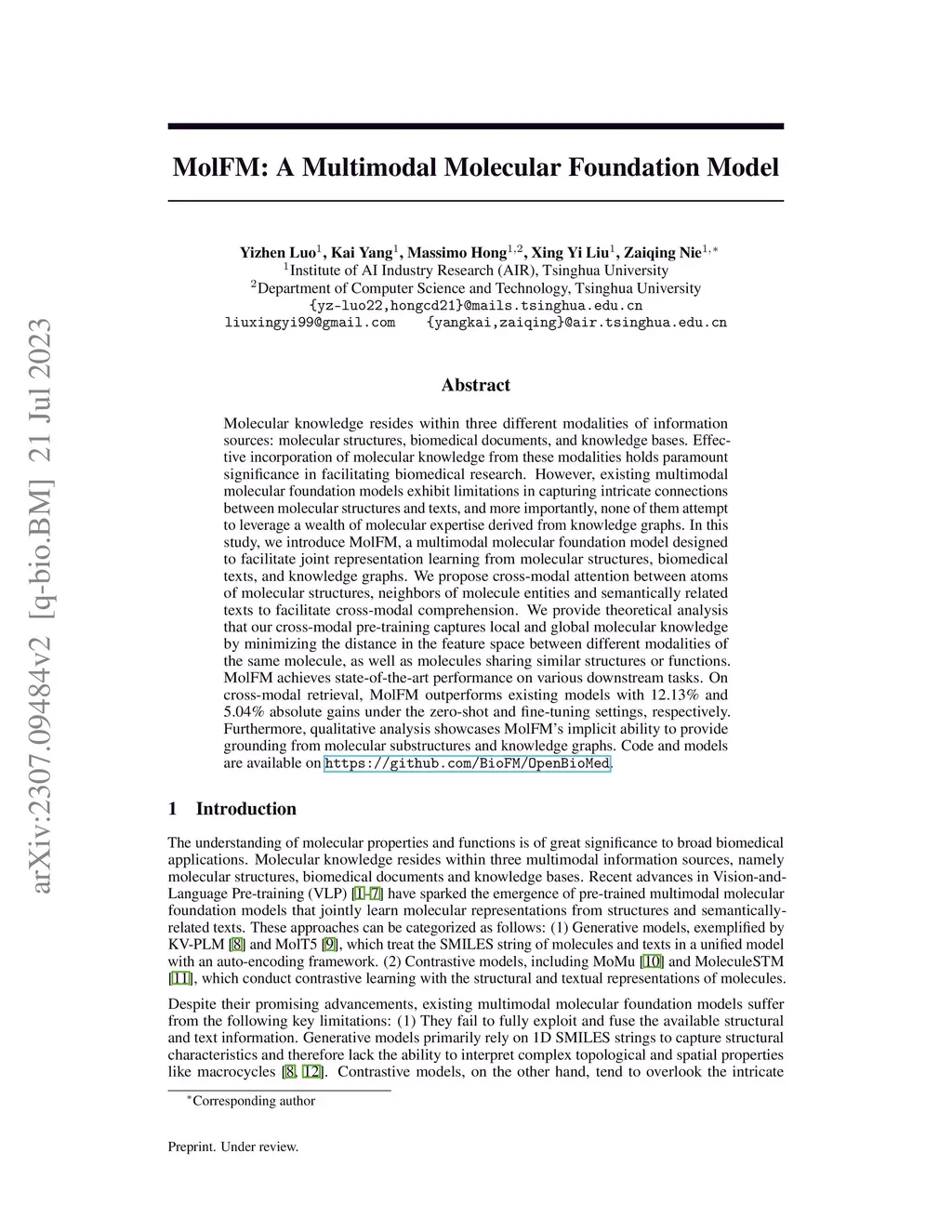 Molecular knowledge resides within three different modalities of information sources: molecular structures, biomedical documents, and knowledge bases. Effective incorporation of molecular knowledge from these modalities holds paramount significance in facilitating biomedical research. However, existing multimodal molecular foundation models exhibit limitations in capturing intricate connections between molecular structures and texts, and more importantly, none of them attempt to leverage a wealth of molecular expertise derived from knowledge graphs. In this study, we introduce MolFM, a multimodal molecular foundation model designed to facilitate joint representation learning from molecular structures, biomedical texts, and knowledge graphs. We propose cross-modal attention between atoms of molecular structures, neighbors of molecule entities and semantically related texts to facilitate cross-modal comprehension. We provide theoretical analysis that our cross-modal pre-training captures local and global molecular knowledge by minimizing the distance in the feature space between different modalities of the same molecule, as well as molecules sharing similar structures or functions. MolFM achieves state-of-the-art performance on various downstream tasks. On cross-modal retrieval, MolFM outperforms existing models with 12.13% and 5.04% absolute gains under the zero-shot and fine-tuning settings, respectively. Furthermore, qualitative analysis showcases MolFM's implicit ability to provide grounding from molecular substructures and knowledge graphs. Code and models are available on https://github.com/BioFM/OpenBioMed.