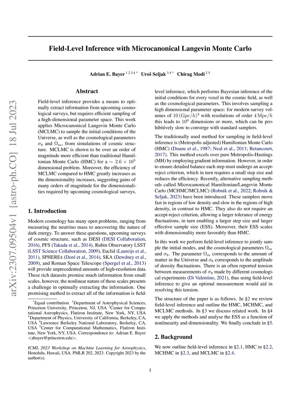 Field-level inference provides a means to optimally extract information from upcoming cosmological surveys, but requires efficient sampling of a high-dimensional parameter space. This work applies Microcanonical Langevin Monte Carlo (MCLMC) to sample the initial conditions of the Universe, as well as the cosmological parameters and , from simulations of cosmic structure. MCLMC is shown to be over an order of magnitude more efficient than traditional Hamiltonian Monte Carlo (HMC) for a dimensional problem. Moreover, the efficiency of MCLMC compared to HMC greatly increases as the dimensionality increases, suggesting gains of many orders of magnitude for the dimensionalities required by upcoming cosmological surveys.