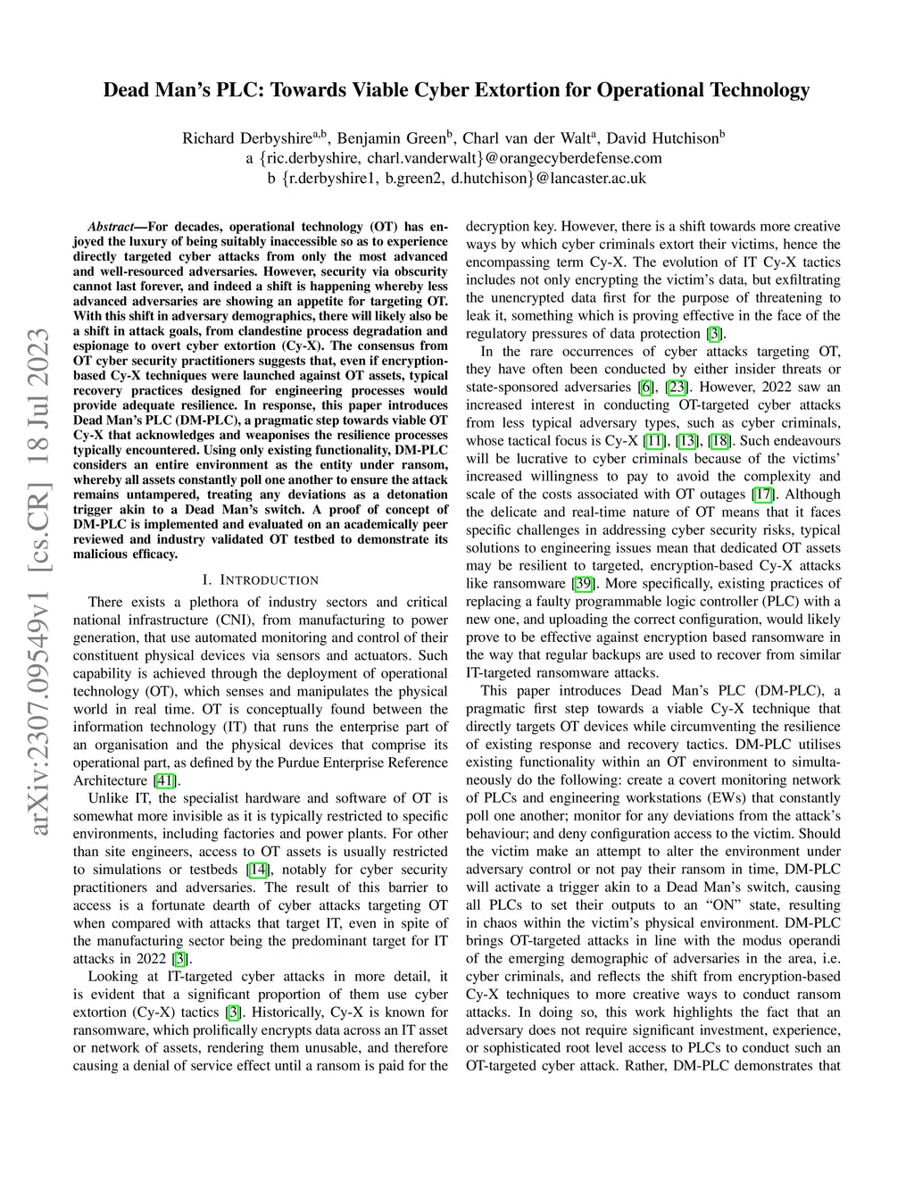 For decades, operational technology (OT) has enjoyed the luxury of being suitably inaccessible so as to experience directly targeted cyber attacks from only the most advanced and well-resourced adversaries. However, security via obscurity cannot last forever, and indeed a shift is happening whereby less advanced adversaries are showing an appetite for targeting OT. With this shift in adversary demographics, there will likely also be a shift in attack goals, from clandestine process degradation and espionage to overt cyber extortion (Cy-X). The consensus from OT cyber security practitioners suggests that, even if encryption-based Cy-X techniques were launched against OT assets, typical recovery practices designed for engineering processes would provide adequate resilience. In response, this paper introduces Dead Man's PLC (DM-PLC), a pragmatic step towards viable OT Cy-X that acknowledges and weaponises the resilience processes typically encountered. Using only existing functionality, DM-PLC considers an entire environment as the entity under ransom, whereby all assets constantly poll one another to ensure the attack remains untampered, treating any deviations as a detonation trigger akin to a Dead Man's switch. A proof of concept of DM-PLC is implemented and evaluated on an academically peer reviewed and industry validated OT testbed to demonstrate its malicious efficacy.