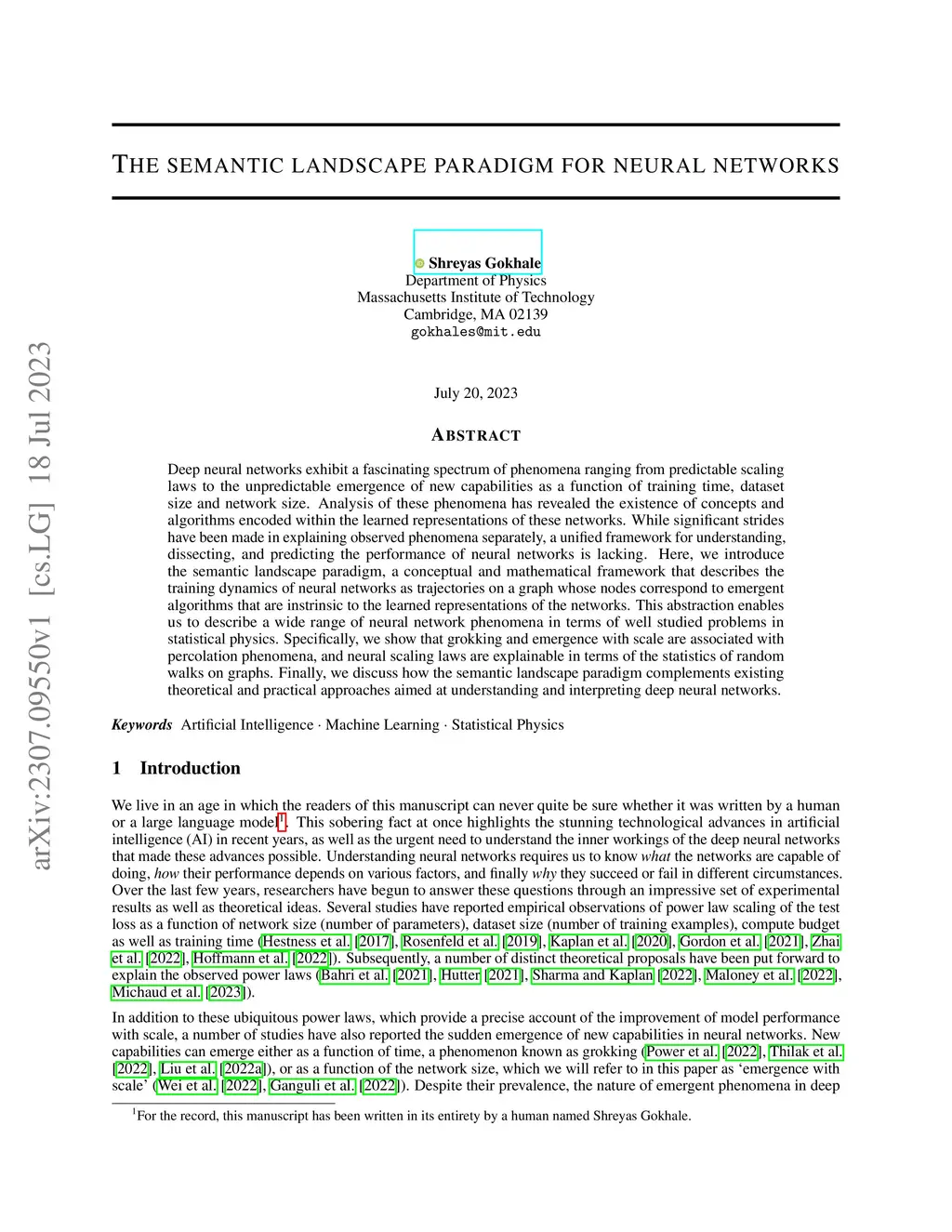 Deep neural networks exhibit a fascinating spectrum of phenomena ranging from predictable scaling laws to the unpredictable emergence of new capabilities as a function of training time, dataset size and network size. Analysis of these phenomena has revealed the existence of concepts and algorithms encoded within the learned representations of these networks. While significant strides have been made in explaining observed phenomena separately, a unified framework for understanding, dissecting, and predicting the performance of neural networks is lacking. Here, we introduce the semantic landscape paradigm, a conceptual and mathematical framework that describes the training dynamics of neural networks as trajectories on a graph whose nodes correspond to emergent algorithms that are instrinsic to the learned representations of the networks. This abstraction enables us to describe a wide range of neural network phenomena in terms of well studied problems in statistical physics. Specifically, we show that grokking and emergence with scale are associated with percolation phenomena, and neural scaling laws are explainable in terms of the statistics of random walks on graphs. Finally, we discuss how the semantic landscape paradigm complements existing theoretical and practical approaches aimed at understanding and interpreting deep neural networks.