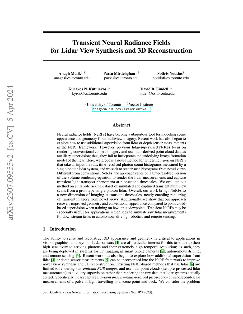 Transient Neural Radiance Fields for Lidar View Synthesis and 3D