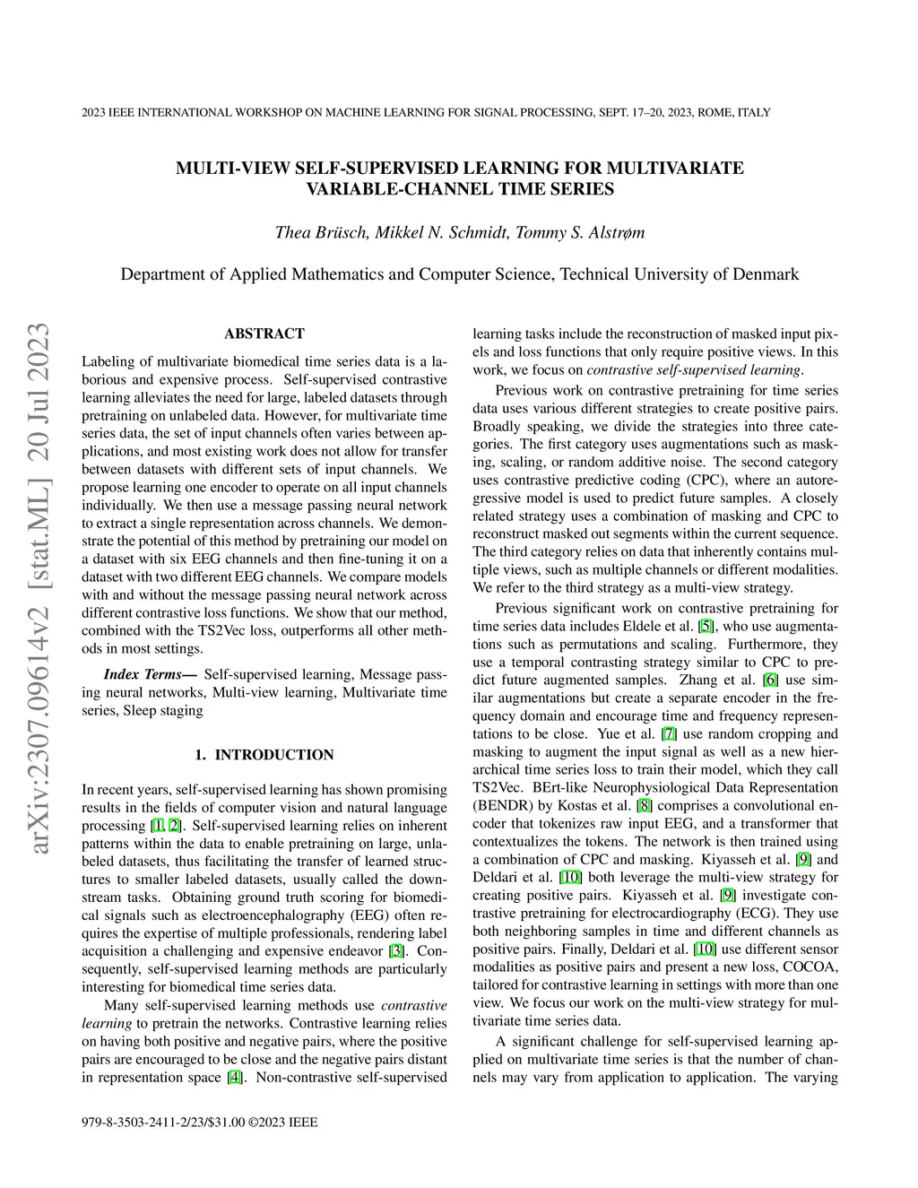 Labeling of multivariate biomedical time series data is a laborious and expensive process. Self-supervised contrastive learning alleviates the need for large, labeled datasets through pretraining on unlabeled data. However, for multivariate time series data, the set of input channels often varies between applications, and most existing work does not allow for transfer between datasets with different sets of input channels. We propose learning one encoder to operate on all input channels individually. We then use a message passing neural network to extract a single representation across channels. We demonstrate the potential of this method by pretraining our model on a dataset with six EEG channels and then fine-tuning it on a dataset with two different EEG channels. We compare models with and without the message passing neural network across different contrastive loss functions. We show that our method, combined with the TS2Vec loss, outperforms all other methods in most settings.