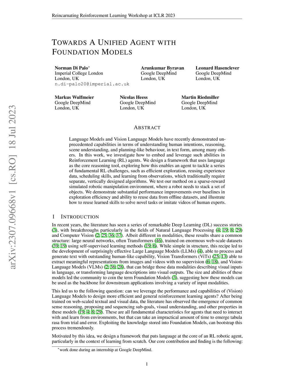 Language Models and Vision Language Models have recently demonstrated unprecedented capabilities in terms of understanding human intentions, reasoning, scene understanding, and planning-like behaviour, in text form, among many others. In this work, we investigate how to embed and leverage such abilities in Reinforcement Learning (RL) agents. We design a framework that uses language as the core reasoning tool, exploring how this enables an agent to tackle a series of fundamental RL challenges, such as efficient exploration, reusing experience data, scheduling skills, and learning from observations, which traditionally require separate, vertically designed algorithms. We test our method on a sparse-reward simulated robotic manipulation environment, where a robot needs to stack a set of objects. We demonstrate substantial performance improvements over baselines in exploration efficiency and ability to reuse data from offline datasets, and illustrate how to reuse learned skills to solve novel tasks or imitate videos of human experts.