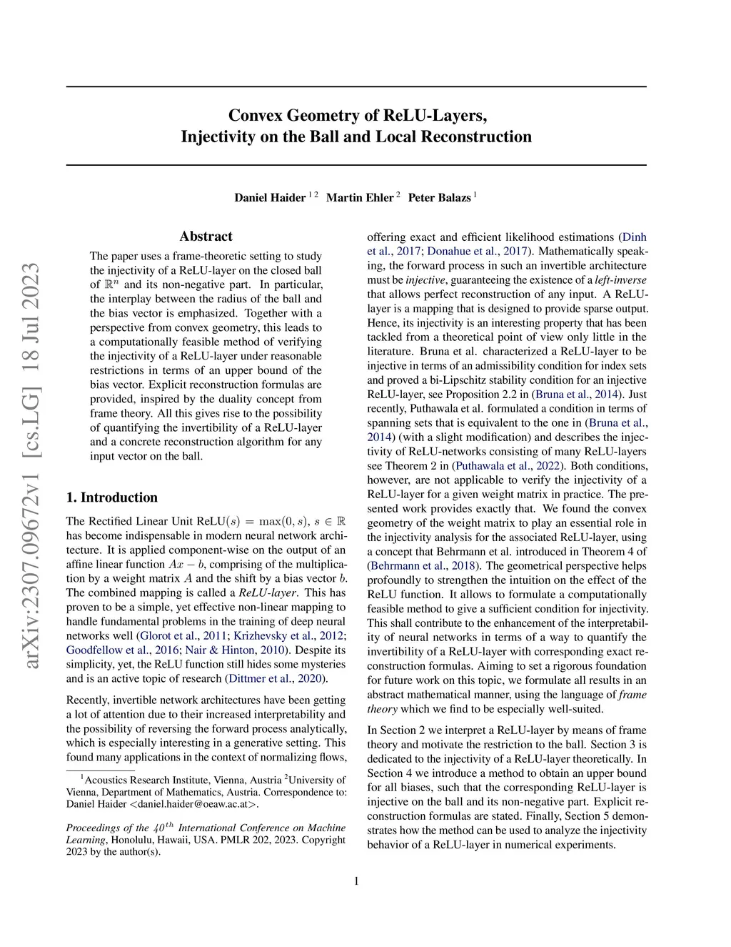 The paper uses a frame-theoretic setting to study the injectivity of a ReLU-layer on the closed ball of and its non-negative part. In particular, the interplay between the radius of the ball and the bias vector is emphasized. Together with a perspective from convex geometry, this leads to a computationally feasible method of verifying the injectivity of a ReLU-layer under reasonable restrictions in terms of an upper bound of the bias vector. Explicit reconstruction formulas are provided, inspired by the duality concept from frame theory. All this gives rise to the possibility of quantifying the invertibility of a ReLU-layer and a concrete reconstruction algorithm for any input vector on the ball.