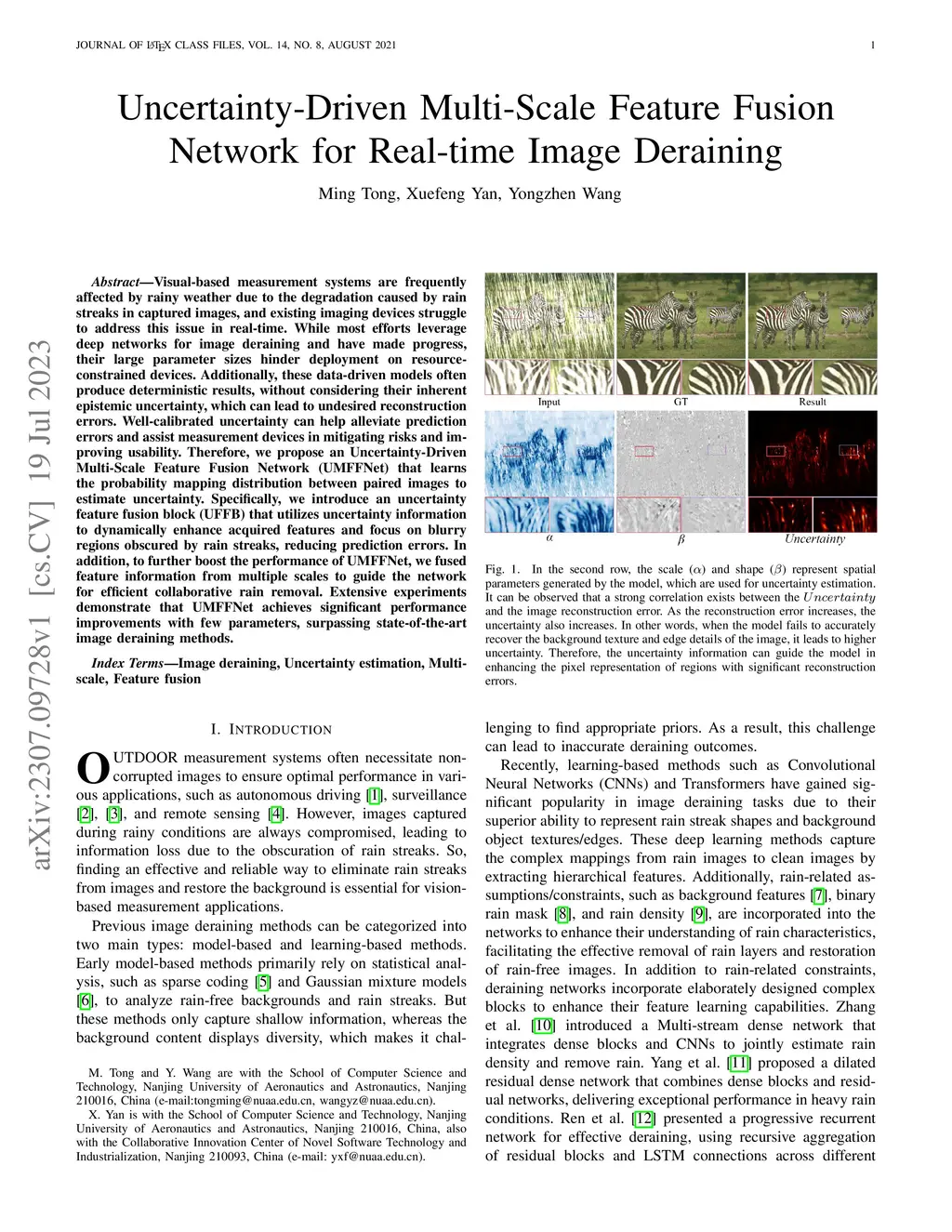Visual-based measurement systems are frequently affected by rainy weather due to the degradation caused by rain streaks in captured images, and existing imaging devices struggle to address this issue in real-time. While most efforts leverage deep networks for image deraining and have made progress, their large parameter sizes hinder deployment on resource-constrained devices. Additionally, these data-driven models often produce deterministic results, without considering their inherent epistemic uncertainty, which can lead to undesired reconstruction errors. Well-calibrated uncertainty can help alleviate prediction errors and assist measurement devices in mitigating risks and improving usability. Therefore, we propose an Uncertainty-Driven Multi-Scale Feature Fusion Network (UMFFNet) that learns the probability mapping distribution between paired images to estimate uncertainty. Specifically, we introduce an uncertainty feature fusion block (UFFB) that utilizes uncertainty information to dynamically enhance acquired features and focus on blurry regions obscured by rain streaks, reducing prediction errors. In addition, to further boost the performance of UMFFNet, we fused feature information from multiple scales to guide the network for efficient collaborative rain removal. Extensive experiments demonstrate that UMFFNet achieves significant performance improvements with few parameters, surpassing state-of-the-art image deraining methods.