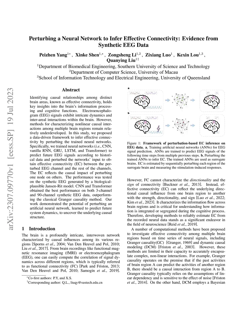 Identifying causal relationships among distinct brain areas, known as effective connectivity, holds key insights into the brain's information processing and cognitive functions. Electroencephalogram (EEG) signals exhibit intricate dynamics and inter-areal interactions within the brain. However, methods for characterizing nonlinear causal interactions among multiple brain regions remain relatively underdeveloped. In this study, we proposed a data-driven framework to infer effective connectivity by perturbing the trained neural networks. Specifically, we trained neural networks (i.e., CNN, vanilla RNN, GRU, LSTM, and Transformer) to predict future EEG signals according to historical data and perturbed the networks' input to obtain effective connectivity (EC) between the perturbed EEG channel and the rest of the channels. The EC reflects the causal impact of perturbing one node on others. The performance was tested on the synthetic EEG generated by a biological-plausible Jansen-Rit model. CNN and Transformer obtained the best performance on both 3-channel and 90-channel synthetic EEG data, outperforming the classical Granger causality method. Our work demonstrated the potential of perturbing an artificial neural network, learned to predict future system dynamics, to uncover the underlying causal structure.