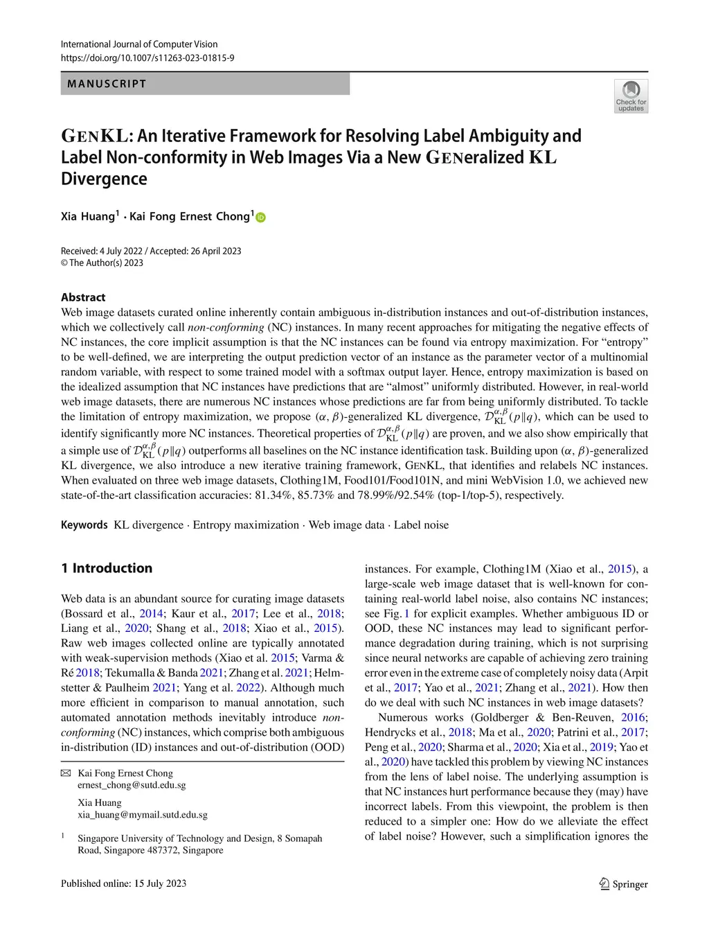 Web image datasets curated online inherently contain ambiguous in-distribution (ID) instances and out-of-distribution (OOD) instances, which we collectively call non-conforming (NC) instances. In many recent approaches for mitigating the negative effects of NC instances, the core implicit assumption is that the NC instances can be found via entropy maximization. For "entropy" to be well-defined, we are interpreting the output prediction vector of an instance as the parameter vector of a multinomial random variable, with respect to some trained model with a softmax output layer. Hence, entropy maximization is based on the idealized assumption that NC instances have predictions that are "almost" uniformly distributed. However, in real-world web image datasets, there are numerous NC instances whose predictions are far from being uniformly distributed. To tackle the limitation of entropy maximization, we propose -generalized KL divergence, , which can be used to identify significantly more NC instances. Theoretical properties of are proven, and we also show empirically that a simple use of outperforms all baselines on the NC instance identification task. Building upon -generalized KL divergence, we also introduce a new iterative training framework, GenKL, that identifies and relabels NC instances. When evaluated on three web image datasets, Clothing1M, Food101/Food101N, and mini WebVision 1.0, we achieved new state-of-the-art classification accuracies: , and / (top-1/top-5), respectively.