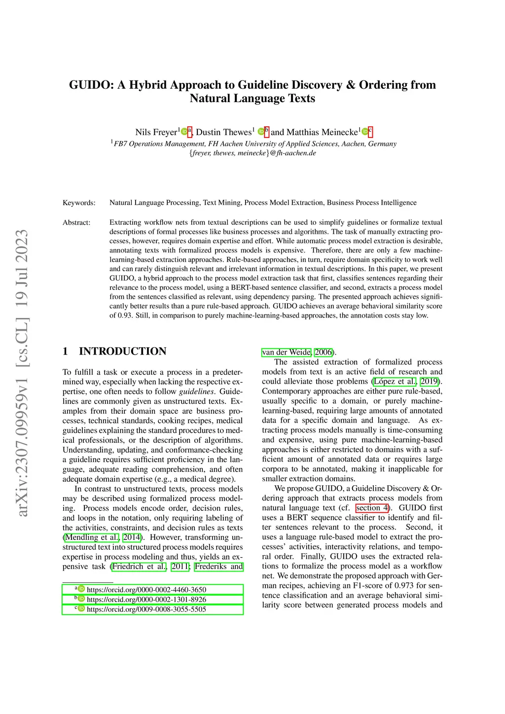 Extracting workflow nets from textual descriptions can be used to simplify guidelines or formalize textual descriptions of formal processes like business processes and algorithms. The task of manually extracting processes, however, requires domain expertise and effort. While automatic process model extraction is desirable, annotating texts with formalized process models is expensive. Therefore, there are only a few machine-learning-based extraction approaches. Rule-based approaches, in turn, require domain specificity to work well and can rarely distinguish relevant and irrelevant information in textual descriptions. In this paper, we present GUIDO, a hybrid approach to the process model extraction task that first, classifies sentences regarding their relevance to the process model, using a BERT-based sentence classifier, and second, extracts a process model from the sentences classified as relevant, using dependency parsing. The presented approach achieves significantly better results than a pure rule-based approach. GUIDO achieves an average behavioral similarity score of . Still, in comparison to purely machine-learning-based approaches, the annotation costs stay low.