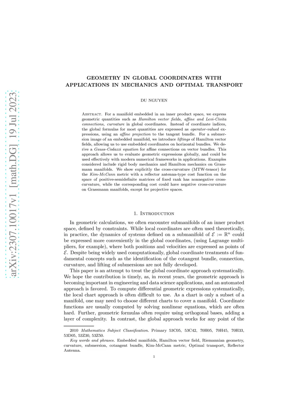 For a manifold embedded in an inner product space, we express geometric quantities such as {\it Hamilton vector fields, affine and Levi-Civita connections, curvature} in global coordinates. Instead of coordinate indices, the global formulas for most quantities are expressed as {\it operator-valued} expressions, using an {\it affine projection} to the tangent bundle. For a submersion image of an embedded manifold, we introduce {\it liftings} of Hamilton vector fields, allowing us to use embedded coordinates on horizontal bundles. We derive a {\it Gauss-Codazzi equation} for affine connections on vector bundles. This approach allows us to evaluate geometric expressions globally, and could be used effectively with modern numerical frameworks in applications. Examples considered include rigid body mechanics and Hamilton mechanics on Grassmann manifolds. We show explicitly the cross-curvature (MTW-tensor) for the {\it Kim-McCann} metric with a reflector antenna-type cost function on the space of positive-semidefinite matrices of fixed rank has nonnegative cross-curvature, while the corresponding cost could have negative cross-curvature on Grassmann manifolds, except for projective spaces.