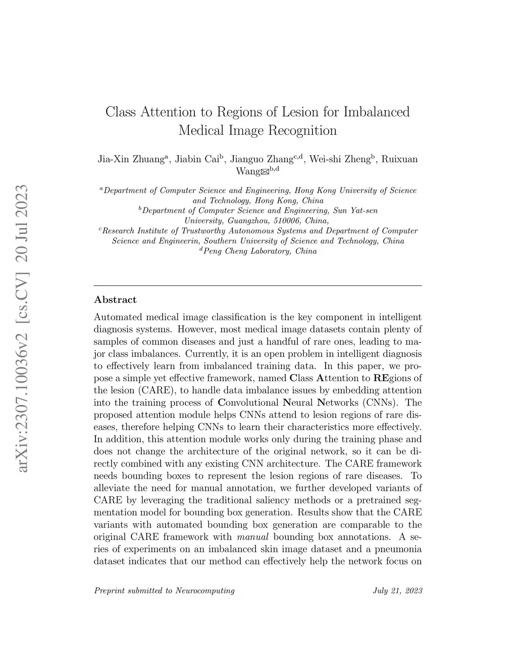 Automated medical image classification is the key component in intelligent diagnosis systems. However, most medical image datasets contain plenty of samples of common diseases and just a handful of rare ones, leading to major class imbalances. Currently, it is an open problem in intelligent diagnosis to effectively learn from imbalanced training data. In this paper, we propose a simple yet effective framework, named \textbf{C}lass \textbf{A}ttention to \textbf{RE}gions of the lesion (CARE), to handle data imbalance issues by embedding attention into the training process of \textbf{C}onvolutional \textbf{N}eural \textbf{N}etworks (CNNs). The proposed attention module helps CNNs attend to lesion regions of rare diseases, therefore helping CNNs to learn their characteristics more effectively. In addition, this attention module works only during the training phase and does not change the architecture of the original network, so it can be directly combined with any existing CNN architecture. The CARE framework needs bounding boxes to represent the lesion regions of rare diseases. To alleviate the need for manual annotation, we further developed variants of CARE by leveraging the traditional saliency methods or a pretrained segmentation model for bounding box generation. Results show that the CARE variants with automated bounding box generation are comparable to the original CARE framework with \textit{manual} bounding box annotations. A series of experiments on an imbalanced skin image dataset and a pneumonia dataset indicates that our method can effectively help the network focus on the lesion regions of rare diseases and remarkably improves the classification performance of rare diseases.