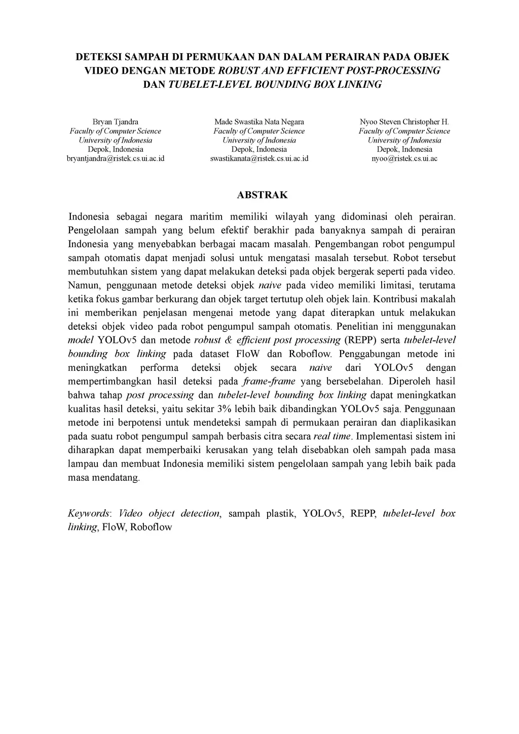 Indonesia, as a maritime country, has a significant portion of its territory covered by water. Ineffective waste management has resulted in a considerable amount of trash in Indonesian waters, leading to various issues. The development of an automated trash-collecting robot can be a solution to address this problem. The robot requires a system capable of detecting objects in motion, such as in videos. However, using naive object detection methods in videos has limitations, particularly when image focus is reduced and the target object is obstructed by other objects. This paper's contribution provides an explanation of the methods that can be applied to perform video object detection in an automated trash-collecting robot. The study utilizes the YOLOv5 model and the Robust & Efficient Post Processing (REPP) method, along with tubelet-level bounding box linking on the FloW and Roboflow datasets. The combination of these methods enhances the performance of naive object detection from YOLOv5 by considering the detection results in adjacent frames. The results show that the post-processing stage and tubelet-level bounding box linking can improve the quality of detection, achieving approximately 3% better performance compared to YOLOv5 alone. The use of these methods has the potential to detect surface and underwater trash and can be applied to a real-time image-based trash-collecting robot. Implementing this system is expected to mitigate the damage caused by trash in the past and improve Indonesia's waste management system in the future.