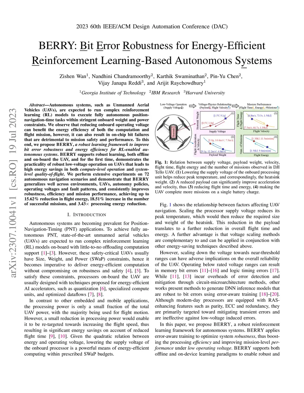 Autonomous systems, such as Unmanned Aerial Vehicles (UAVs), are expected to run complex reinforcement learning (RL) models to execute fully autonomous position-navigation-time tasks within stringent onboard weight and power constraints. We observe that reducing onboard operating voltage can benefit the energy efficiency of both the computation and flight mission, however, it can also result in on-chip bit failures that are detrimental to mission safety and performance. To this end, we propose BERRY, a robust learning framework to improve bit error robustness and energy efficiency for RL-enabled autonomous systems. BERRY supports robust learning, both offline and on-board the UAV, and for the first time, demonstrates the practicality of robust low-voltage operation on UAVs that leads to high energy savings in both compute-level operation and system-level quality-of-flight. We perform extensive experiments on 72 autonomous navigation scenarios and demonstrate that BERRY generalizes well across environments, UAVs, autonomy policies, operating voltages and fault patterns, and consistently improves robustness, efficiency and mission performance, achieving up to 15.62% reduction in flight energy, 18.51% increase in the number of successful missions, and 3.43x processing energy reduction.