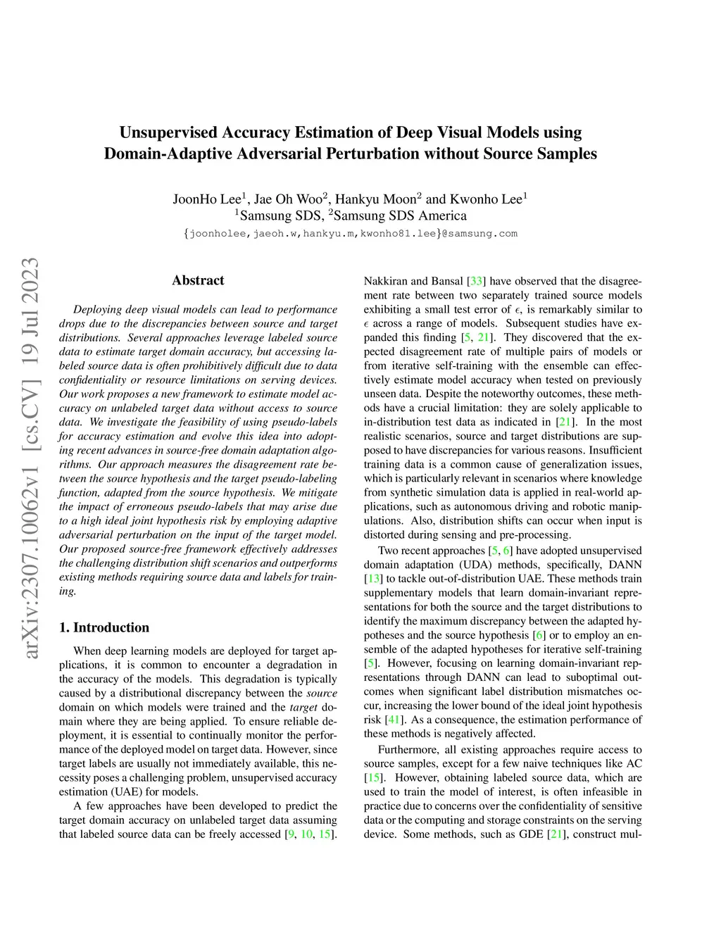 Deploying deep visual models can lead to performance drops due to the discrepancies between source and target distributions. Several approaches leverage labeled source data to estimate target domain accuracy, but accessing labeled source data is often prohibitively difficult due to data confidentiality or resource limitations on serving devices. Our work proposes a new framework to estimate model accuracy on unlabeled target data without access to source data. We investigate the feasibility of using pseudo-labels for accuracy estimation and evolve this idea into adopting recent advances in source-free domain adaptation algorithms. Our approach measures the disagreement rate between the source hypothesis and the target pseudo-labeling function, adapted from the source hypothesis. We mitigate the impact of erroneous pseudo-labels that may arise due to a high ideal joint hypothesis risk by employing adaptive adversarial perturbation on the input of the target model. Our proposed source-free framework effectively addresses the challenging distribution shift scenarios and outperforms existing methods requiring source data and labels for training.