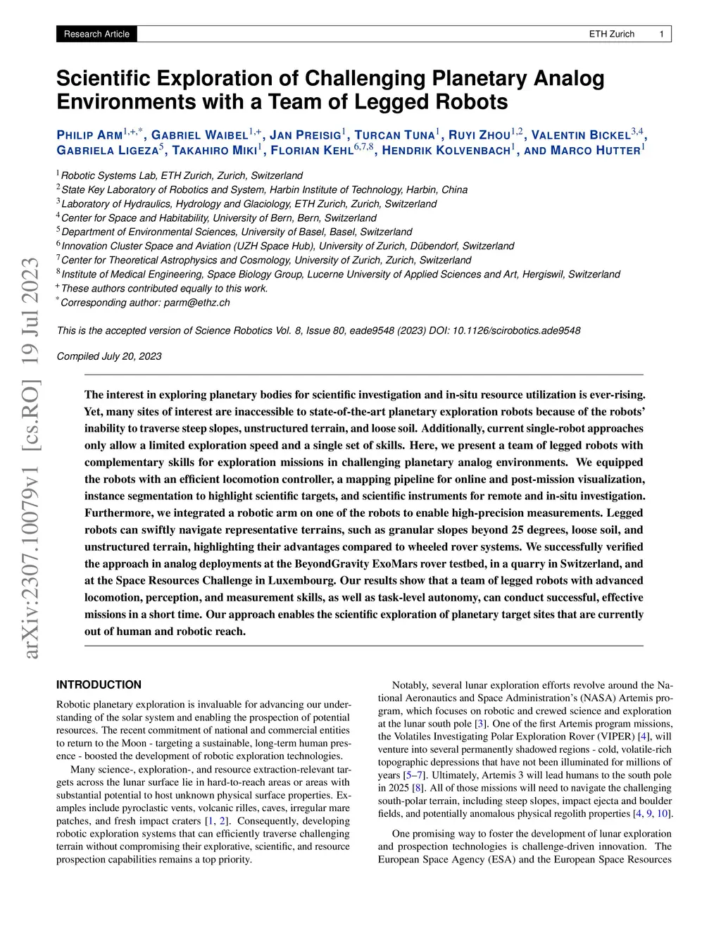 The interest in exploring planetary bodies for scientific investigation and in-situ resource utilization is ever-rising. Yet, many sites of interest are inaccessible to state-of-the-art planetary exploration robots because of the robots' inability to traverse steep slopes, unstructured terrain, and loose soil. Additionally, current single-robot approaches only allow a limited exploration speed and a single set of skills. Here, we present a team of legged robots with complementary skills for exploration missions in challenging planetary analog environments. We equipped the robots with an efficient locomotion controller, a mapping pipeline for online and post-mission visualization, instance segmentation to highlight scientific targets, and scientific instruments for remote and in-situ investigation. Furthermore, we integrated a robotic arm on one of the robots to enable high-precision measurements. Legged robots can swiftly navigate representative terrains, such as granular slopes beyond 25 degrees, loose soil, and unstructured terrain, highlighting their advantages compared to wheeled rover systems. We successfully verified the approach in analog deployments at the BeyondGravity ExoMars rover testbed, in a quarry in Switzerland, and at the Space Resources Challenge in Luxembourg. Our results show that a team of legged robots with advanced locomotion, perception, and measurement skills, as well as task-level autonomy, can conduct successful, effective missions in a short time. Our approach enables the scientific exploration of planetary target sites that are currently out of human and robotic reach.