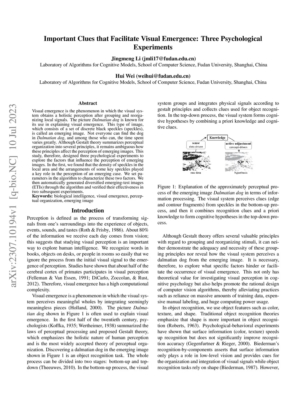 Visual emergence is the phenomenon in which the visual system obtains a holistic perception after grouping and reorganizing local signals. The picture Dalmatian dog is known for its use in explaining visual emergence. This type of image, which consists of a set of discrete black speckles (speckles), is called an emerging image. Not everyone can find the dog in Dalmatian dog, and among those who can, the time spent varies greatly. Although Gestalt theory summarizes perceptual organization into several principles, it remains ambiguous how these principles affect the perception of emerging images. This study, therefore, designed three psychological experiments to explore the factors that influence the perception of emerging images. In the first, we found that the density of speckles in the local area and the arrangements of some key speckles played a key role in the perception of an emerging case. We set parameters in the algorithm to characterize these two factors. We then automatically generated diversified emerging-test images (ETIs) through the algorithm and verified their effectiveness in two subsequent experiments.