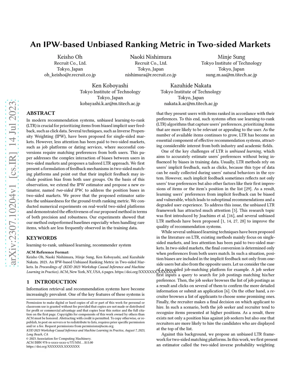 An IPW-based Unbiased Ranking Metric in Two-sided Markets