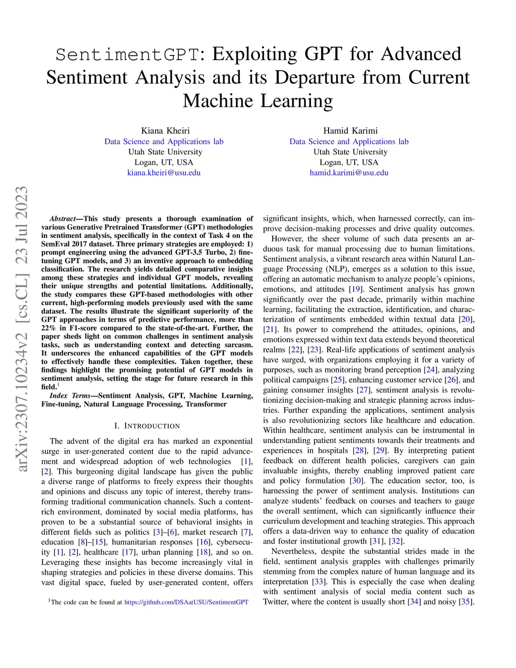 This study presents a thorough examination of various Generative Pretrained Transformer (GPT) methodologies in sentiment analysis, specifically in the context of Task 4 on the SemEval 2017 dataset. Three primary strategies are employed: 1) prompt engineering using the advanced GPT-3.5 Turbo, 2) fine-tuning GPT models, and 3) an inventive approach to embedding classification. The research yields detailed comparative insights among these strategies and individual GPT models, revealing their unique strengths and potential limitations. Additionally, the study compares these GPT-based methodologies with other current, high-performing models previously used with the same dataset. The results illustrate the significant superiority of the GPT approaches in terms of predictive performance, more than 22\% in F1-score compared to the state-of-the-art. Further, the paper sheds light on common challenges in sentiment analysis tasks, such as understanding context and detecting sarcasm. It underscores the enhanced capabilities of the GPT models to effectively handle these complexities. Taken together, these findings highlight the promising potential of GPT models in sentiment analysis, setting the stage for future research in this field. The code can be found at https://github.com/DSAatUSU/SentimentGPT