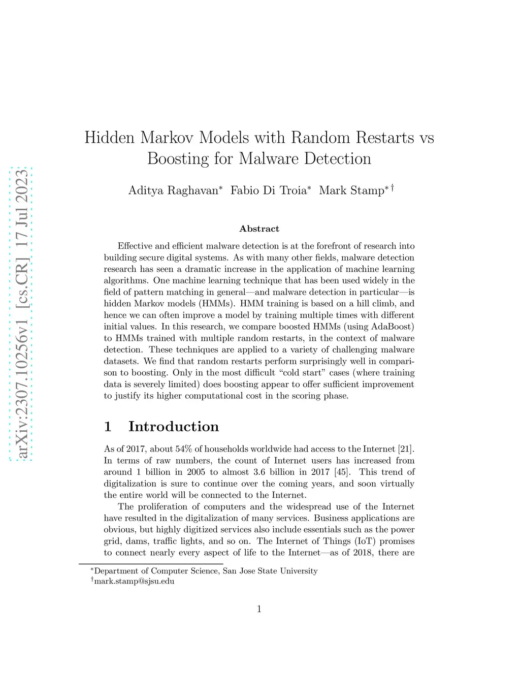 Hidden Markov Models with Random Restarts vs Boosting for Malware